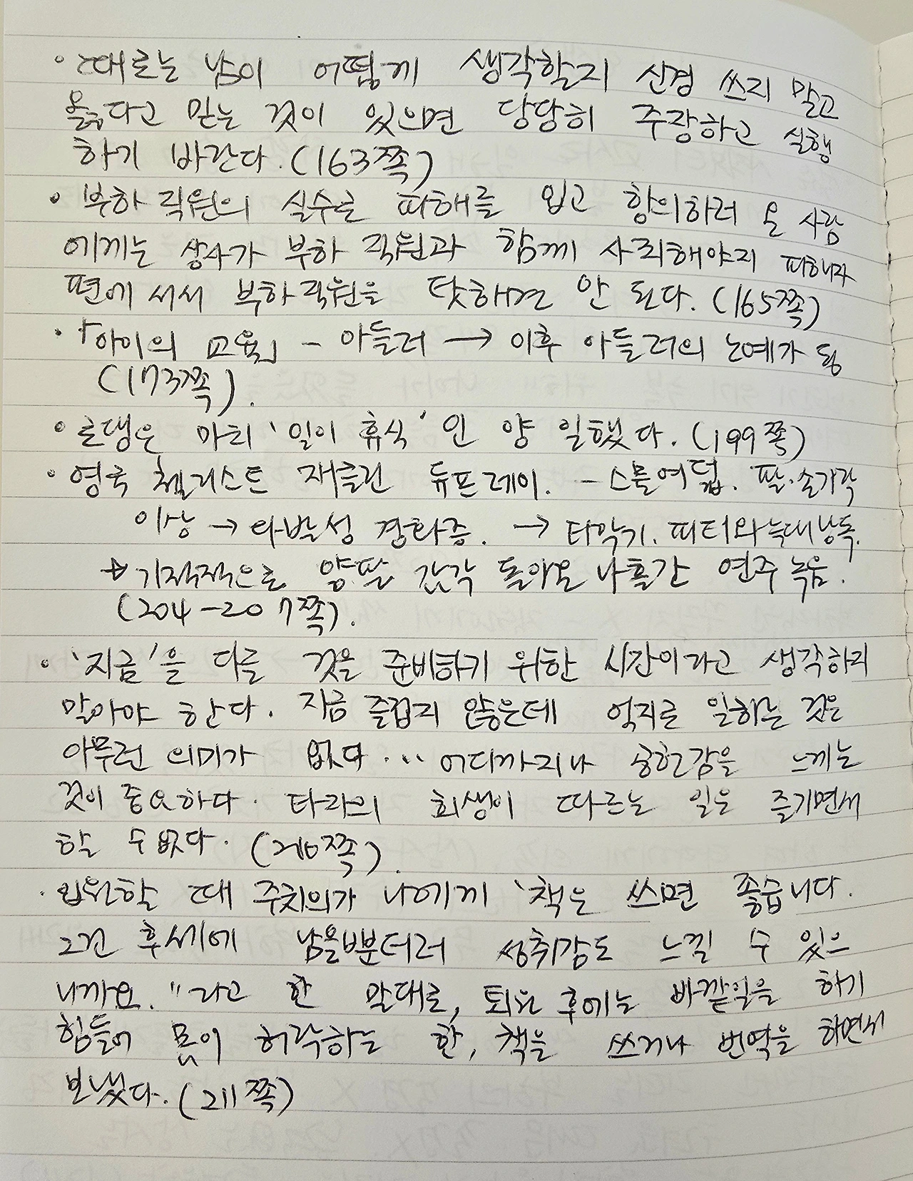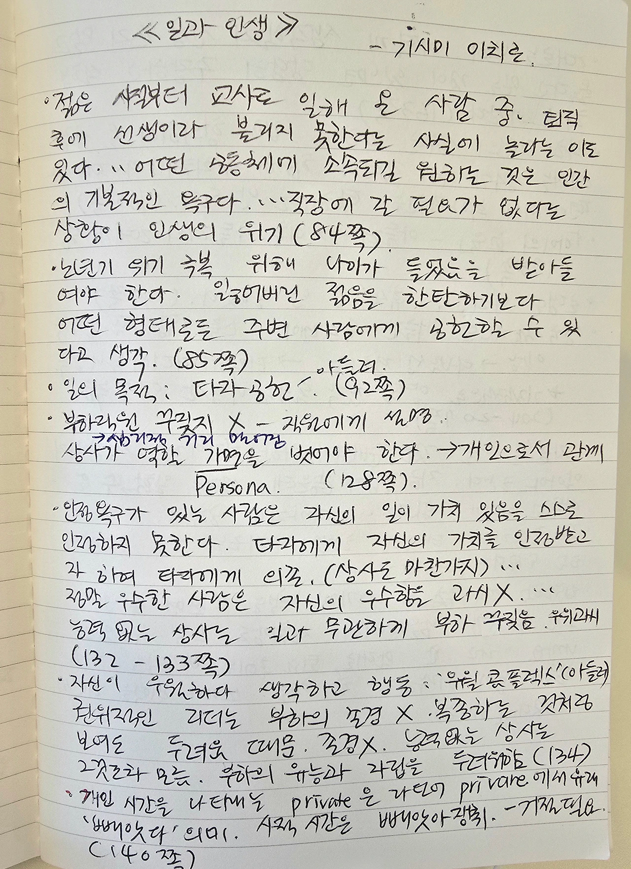 미움받을 용기에서도 역설했듯 거절도 잘할 줄 알아야 한다. 개인 시간을 뜻하는 'private'에 '빼앗다'라는 라틴어 의미가 있을 줄이야. 개인 시간은 쟁취하지 않으면 얻기 어려운 것일 수도 있겠다. 책에는 부하에게 화를 내지 말라는 충고도 등장한다. 그 순간에는 복종하는 것처럼 보일지 모르나 결국 마음의 거리가 생기게 하는 일이다. 부하직원의 실수에 함께 사과할 수 있는 상사야말로 존경받는 사람이 될 수 있다.