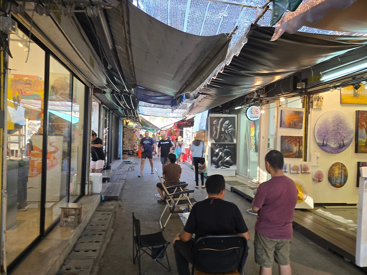 혼자였으면 통로로 가서 예쁜 카페에 앉아 책을 읽었을 텐데 남편과 함께라 짜뚜짝 시장으로 향했다. 주말에만 열리는 시장이라 마지막 기회였다. BTS역으로 가 몇 정거장만에 도착하니 사람들이 모두 그쪽을 향해 거고 있어 따라갔다. 엄청 넓은 시장과 많은 사람들로 축제 분위기였고, 그동안 지나친 많은 상점들과는 조금 다르고 꽤 괜찮은 물건들도 많아 구경하는 재미가 있었다. 햇살이 너무 따가운데 에어컨 시설은 별로 없어 여름에 왔다면 힘들었겠다 싶었다. 그나마 그늘은 바람이 불면 시원했다. 걷다 보니 땀이 나서 머리핀을 사서 틀어 올리고, 남편 지압봉과 허리띠, 그리고 내 바지를 하나 샀다. 돌아가서 드릴 분들의 선물도 살까 했지만 마트에서 사는 게 나을 것 같아 음료만 마시고 나왔다.