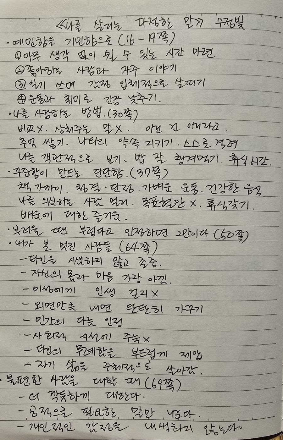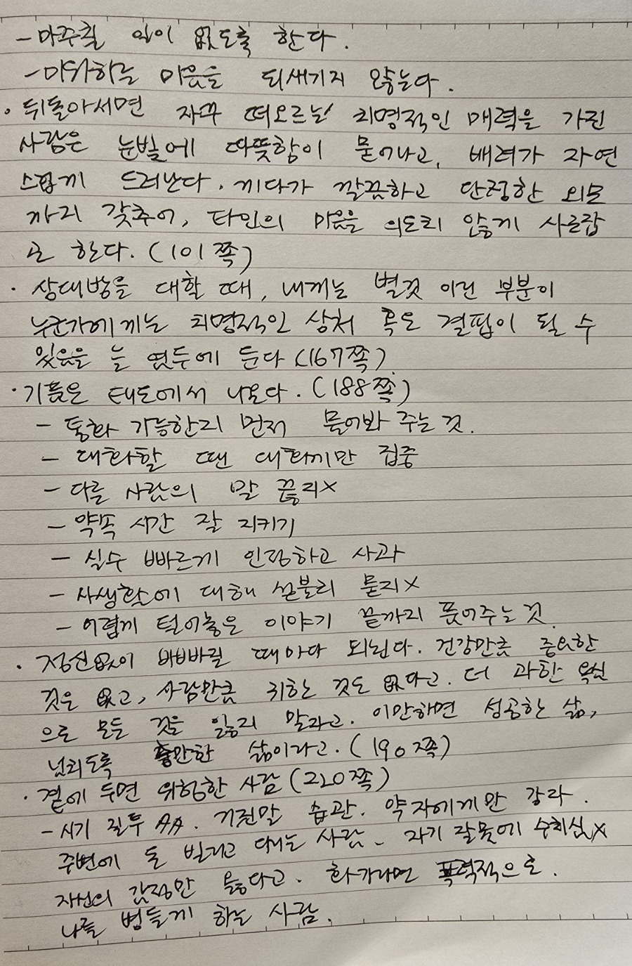 불편한 사람을 대할 때는 그 사람을 내 편으로 만들려고 에너지를 쏟기보다 오히려 더 깍듯하게 대하고, 공적인 말만 하며, 개인적인 감정을 내색하지 않고 되도록 마주치지 않고 미워하는 마음을 되새기지 않도록 하는 게 좋다고 하였다. 누구에게나 이런 사람이 있을 수 있고, 어떤 때는 관계를 회복하고자 노력하지만 더 멀어질 수 있으므로 어느 정도의 거리를 두고 공손히 대할 필요가 있음을 책을 통해 알게 되어 좋았다.