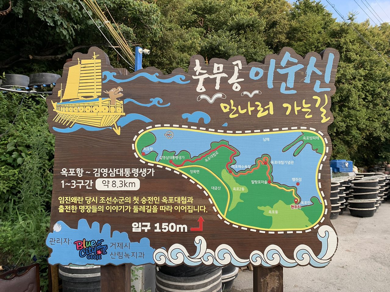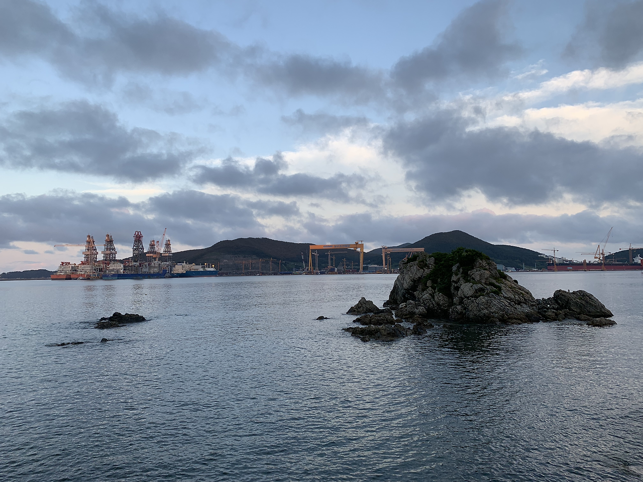 숙소를 나와 조금 걸어가니 바로 바다였다. 우리가 묵을 곳이 옥포항이었던 것이다. 예약할 때는 느낌이 없었는데 와 보니 실감이 났다. 숙소 찾을 때 막 퇴근 중인 조선소 직원 분들이 보여 뭔가 새로운 기분이었다. 여행할 때 그곳 주민들의 생활모습을 보는 것이 가장 즐겁다. 바다에 떠 있는 거대한 붉은 배와 시드니 오페라하우스를 닮은 작은 구조물, 그리고 바다와 하늘을 계속 찍었다. 임진왜란 해전 첫 승전지라는 큰 돌로 된 비석도 보였다. 바다를 따라 산책로 같은 게 보여서 그쪽으로 걸어갔다. 입구에 충무공 이순신 만나러 가는 길이라는 표지판이 있었다. 그 지점에서부터 김영삼 대통령 생가까지 8.3킬로미터의 산책로였다. 옥포대첩 기념관과 덕포 해수욕장을 지나는 길이었다. 나무로 길을 잘 만들어 놓아 왼쪽은 바로 산, 오른쪽은 바다여서 멋진 산책 코스라고 생각하며 걸어 들어갔다. 끝까지 가기엔 곧 어둠이 내릴 것이고, 슬리퍼 차림이어서 3코스 중 1 코스만 걷다가 나왔다. 간간이 외국인과 부부 몇 쌍이 지나갔고, 튀어나온 부분마다 있는 정자에는 동네 분들이 경상도 사투리로 환담을 나누고 계셔서 정겨웠다.