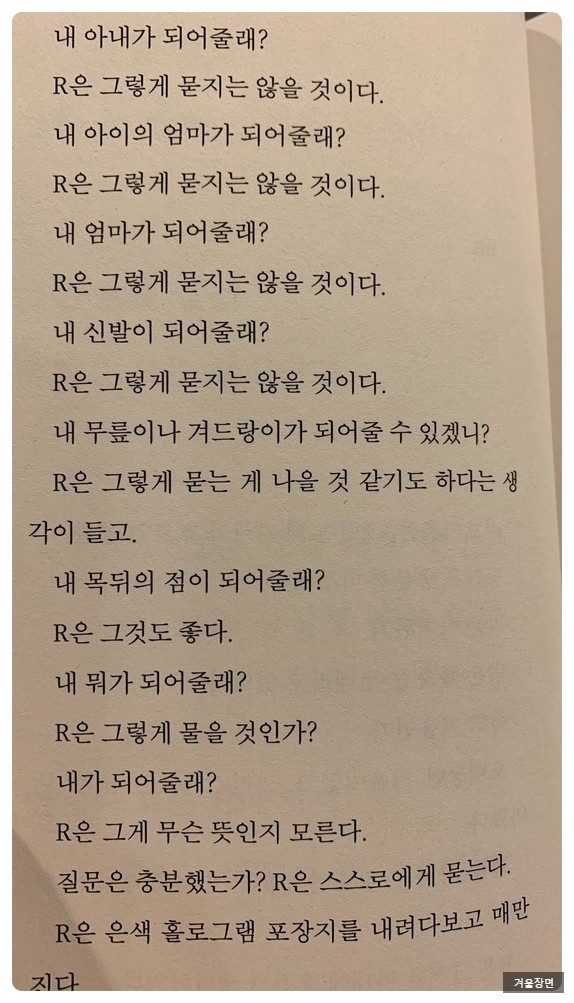이 소설의 해석이 궁금해 다른 분들이 읽고 쓴 글들을 찾아보았다. 내가 보지 못한 부분들을 알아챈 분들도 있었고, 대부분은 어느 부분을 먼저 읽어도 상관없는 생각의 조각들임을 이야기하고 있었다. 사람들이 죽으러 간다는 제인 호수에서 R은 돌아왔을까? 그는 죽고 싶은 생각이 없었다고 말했고, 호수 입구 매점의 스키바지 입은 남자는 언 호수 바닥에서 검은 점퍼를 발견한다. 책의 앞부분에 호수 바닥에 넘어져 있던 R이 자신이 왜 거기에 있었는지 모르게 일어나 함께 간 아내의 행방을 모르는 채 돌아오는 장면을 떠올리며 좋은 결말을 상상한다. 앞으로도 그는 기억의 파편들 속에서 시간이 뒤죽박죽 된 채 살아가더라도 말이다. 아내는 원래 없었던 것이라 믿으며, 의학의 힘을 빌어 다시 시간 순서대로 정리된 삶을 살게 되기를.