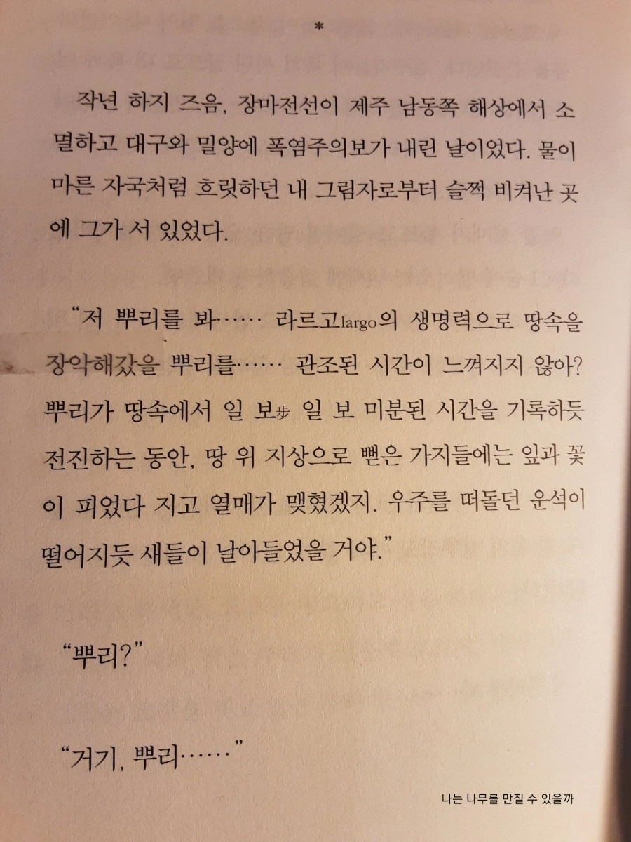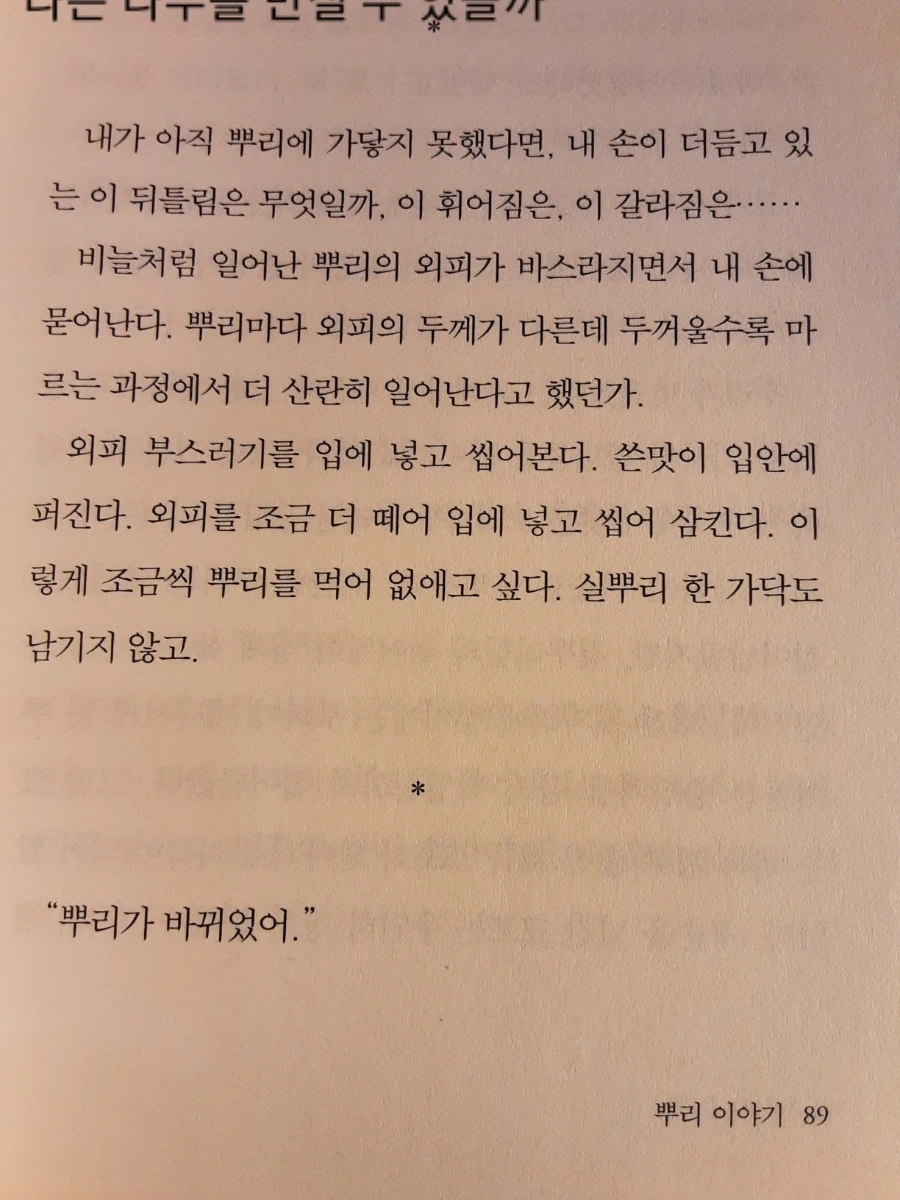 평소 낙관적인 성격을 지닌 나는 책 속 주인공이 어머니의 느림을 따르기 위해 빠른 발을 부끄러워하고 심지어 화분에 발을 넣어 뿌리내리고 싶다는 것을 보며 기함했다. 느린 것은 느린 것이고, 빠른 건 빠른 것인데 빠른 걸 싫어하게 되다니 이해할 수 없었다. 지붕에 구멍을 뚫고 그 속에 빠지고 싶어 한다는 것도 정말 철학적인 발상이다. 대놓고 판타지스러운 이야기가 아니라 미묘한 심리 묘사가 더 섬뜩함을 주고 환상적으로 만든다. 발에서 뿌리내리는 발상은 오래전 읽은 한강 작가의 <채식주의자>에서도 비슷하게 등장하였다. 정상적인 사람이라면 생각지 못할 것을 작가는 생각하고 글로 쓴다는 것이 범상하다.