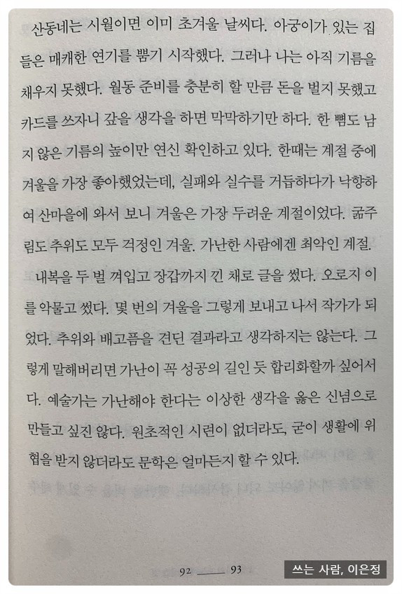 첫 책에 대한 인세로 해결한 밀린 공과금. 이후로도 얼마나 쪼들리며 살았을까? 누군가는 그녀에게 후원을 하기도 했다. 가난한 문학인을 돕는 일이 그의 글을 알리는 일이라는 의무감이 밀려왔다. 어쨌든 글은 솔직하고도 감동적이다. 가난이 글의 동력이 될 수 있을까? 추운 방에서 오롯이 글쓰기에 매달렸을 손이 곱은 작가의 모습을 떠올린다.