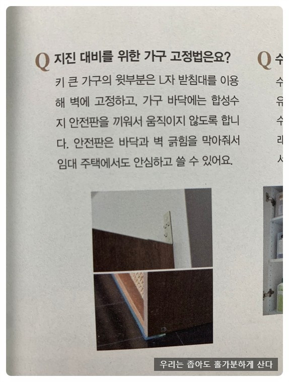 일본인 저자인 이 책에는 지진 대비에 대한 내용이 나와서 신기했다. 지진을 늘 대비하며 살아가야 하는 일본인에게는 그 또한 중요한 인테리어의 기준이 되나 보다. 이 책에 나오는 분들이 모두 비슷한 스타일을 가진 건 아니다. 숨기는 인테리어를 좋아하는 분, 예쁘게 늘어놓길 좋아하는 분, 앉은뱅이 가구로 넓어 보이게 하는 분, 큰 가구 하나를 여러 용도로 사용하신 분. 그 말은 남들의 이야기도 중요하지만 자신에게 가장 알맞은 정리법과 인테리어를 선택하면 된다는 뜻이리라.