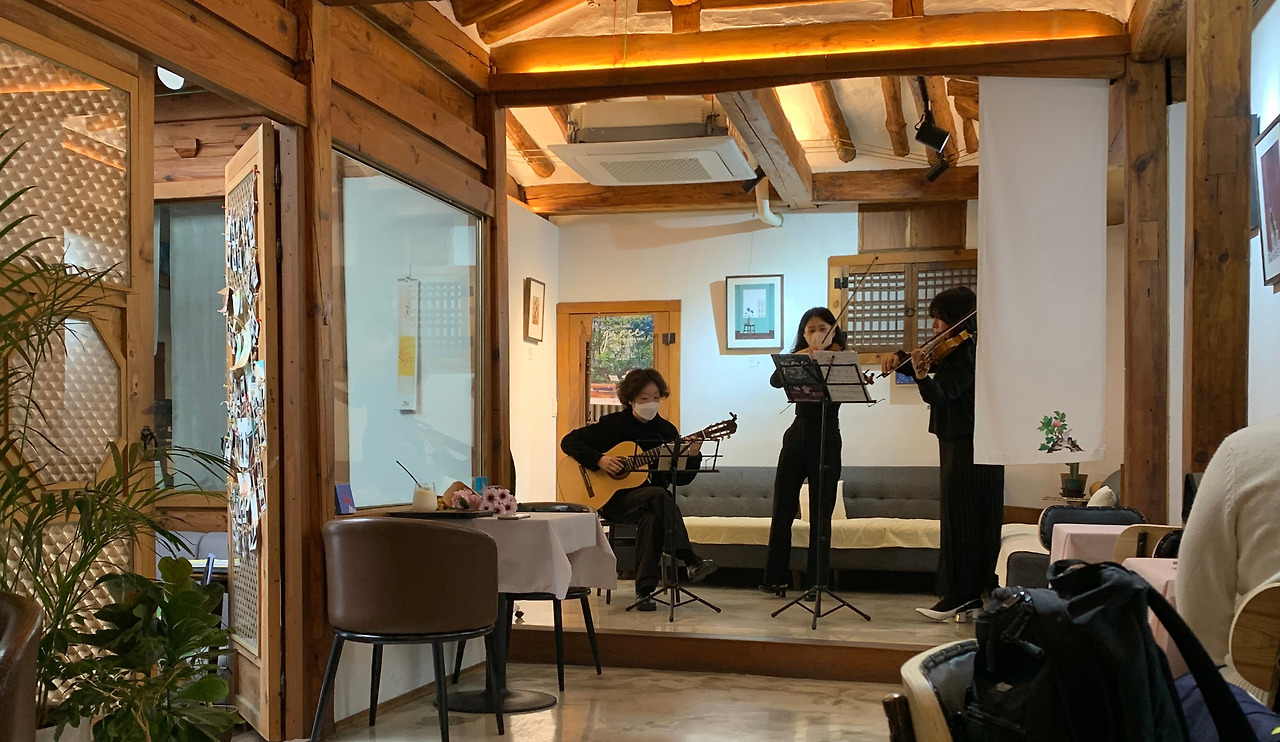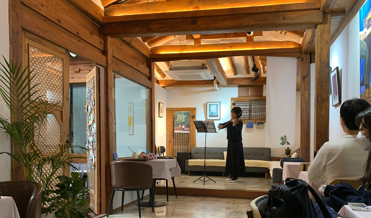 약속도 생기고 하여 못 갈 형편이었는데 중요한 결혼식이 공연하는 카페 근처에서 그 전 시간에 있어 약속을 저녁으로 미루고 결혼식에 가게 되면서 연주도 보고 올 수 있었다. 사실 결혼식에 참여하는 것도 거의 2년 만이라 그렇게 많은 사람들이 북적이는 결혼식장이 조금은 낯설기도 했다. 뷔페 음식 맛이 너무 좋아 함께 간 학교 선생님들과 담소를 나누다 연주회에 조금 늦어 첫 곡을 놓쳤다.