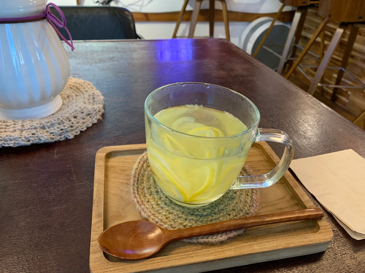 멘트 중 소원에 대한 이야기를 나누다가 몇 안 되는 관람객 중 나에게 소원을 물으셨다. 그래서 사실은 블로그 이웃 켈리라고 말씀드렸더니 정말 놀라셨다. 이웃 글 알람을 켜 둔 둘 중 한 명이라고 하셔서 영광이었다. 끝나고는 주랑님의 언니 되시는 분이 레몬차를 사 주셨다. 손으로 뜬 듯한 단아한 연보라 카디건을 입은 분이었다. 연주 내내 따뜻한 눈빛으로 동생을 바라보는 모습이 아름다웠다. 원래 캘리그래피 작가님으로 이분이 먼저 그 카페에서 전시회에 참여하셨다고 했다. 연주 중간에 여동생도 들어오셨는데 멘트 도중 ‘일찍 일찍 다녀’ 하신 것도 너무 웃겼다.