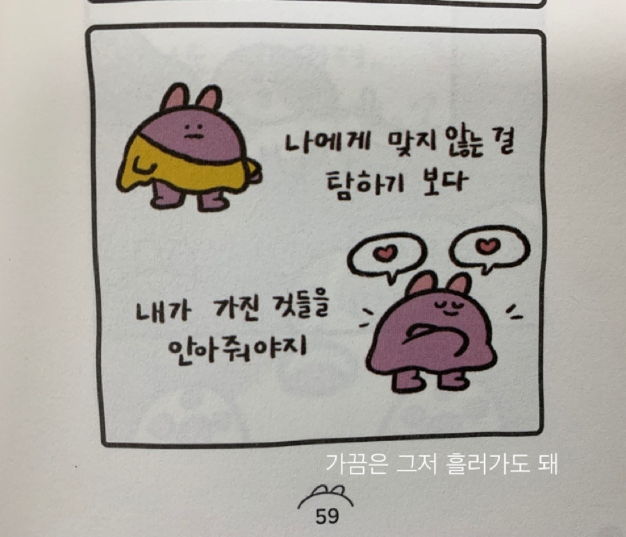 그림 그리기를 좋아했던 저자는 이렇게 귀여운 캐릭터를 만들고 이야기를 쓰면서도 다른 이와 비교하며 불행했던 시절이 있었다고 한다. 하지만 불안할 때 자신의 상황을 알아차리고 잘 대응하면 금세 빠져나올 수 있다고 하였다. 경험에서 나온 여러 가지 삶의 조언들은 20대가 하는 이야기 같지 않게 철학적이고 해탈의 경지에 이른 사람 같다. 사실 이론적으로는 이렇게 말하지만 실천이 쉽지만은 않았을 것이다. 누구나 그러니까. 하지만 힘들 때 힘들다는 걸 깨닫고 대처하는 것이 아무 생각 없이 흘러가는 시간에 휩쓸리는 것보다는 나을 것이다.