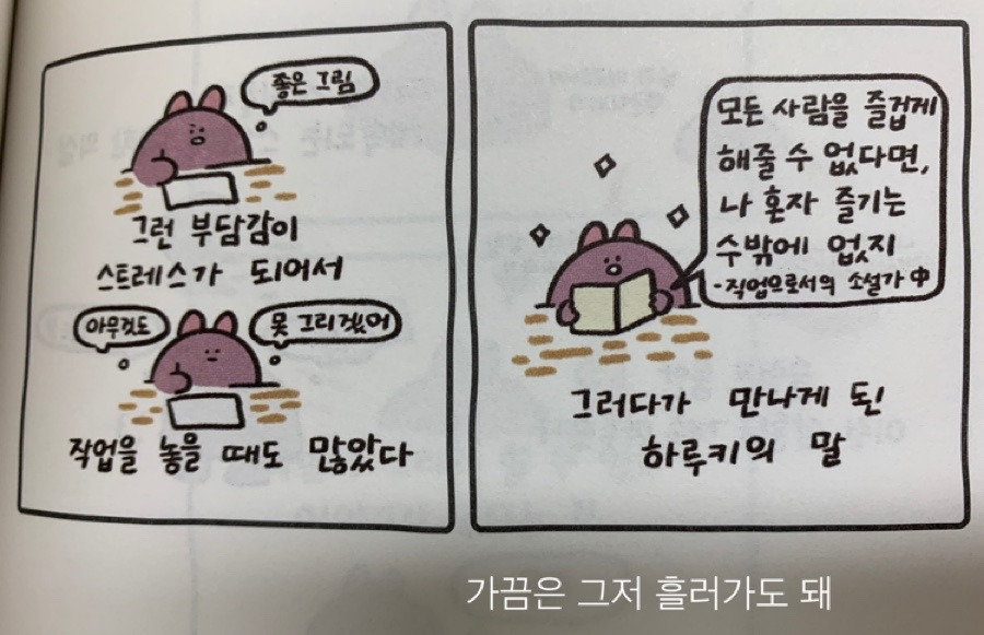 어려움 속에서도 꾸준히 노력했던 저자의 이 책은 아마도 많은 이들에게 사랑을 받을 것 같다. 글자가 많지 않고, 빈 공간이 많아 여운이 느껴지는 책이다. 모든 사람을 만족시킬 수 없다면 혼자서라도 즐기라는 하루키 인용 부분이 기억에 남는다.