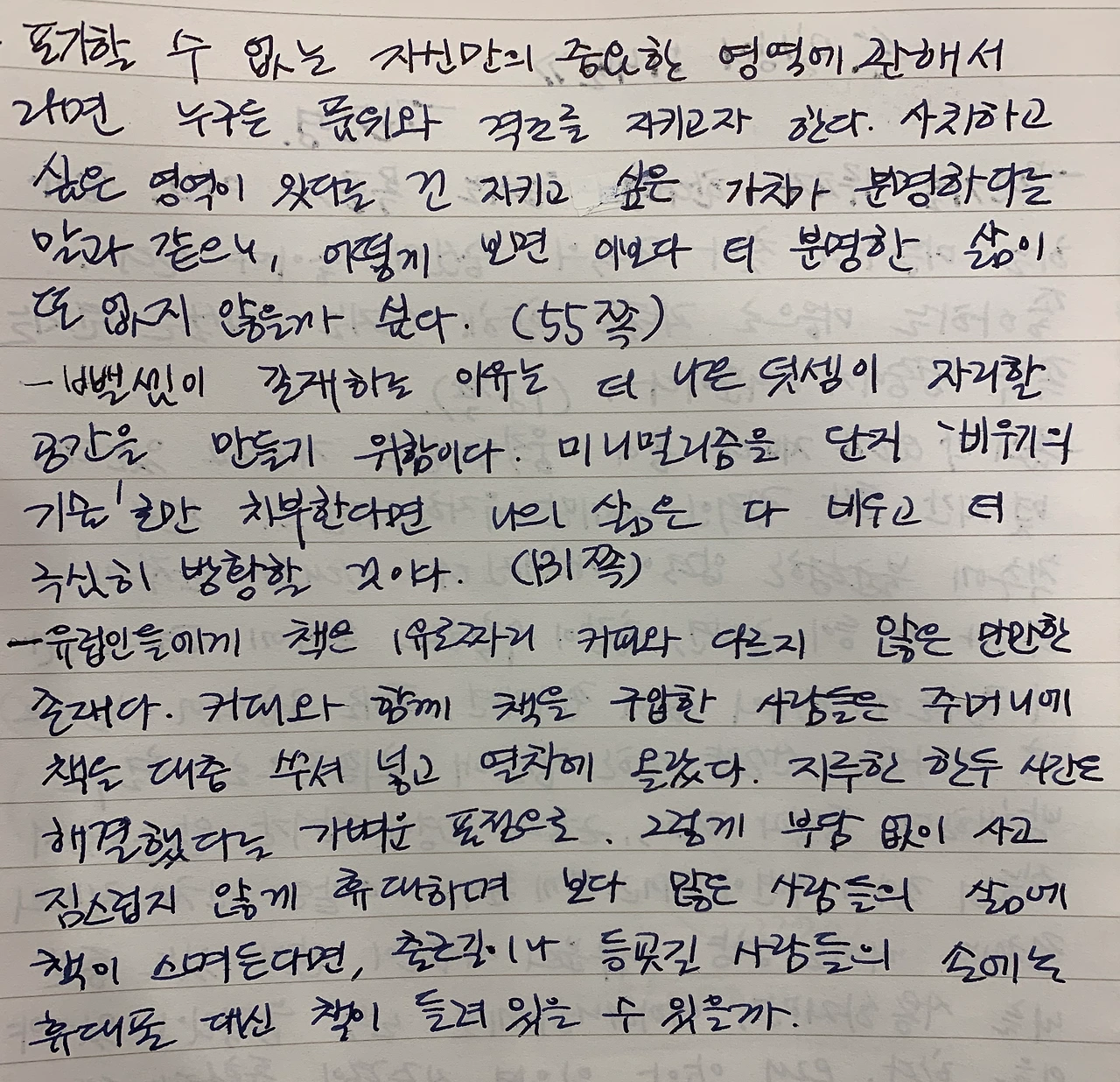 과도한 미니멀 라이프는 오히려 삶을 피폐하게 만들 수도 있다. 매일 만 원의 생활비를 스스로 책정하여 월 생활비 30만 원을 넘기지 않는다는 저자는 자신이 중점을 두는 한 분야에 있어서는 최고의 가치를 지닌 제품을 선호하기도 한다. 특히 몰스킨이라는 수첩을 사는 일인데 글을 자주 쓰고 책을 많이 낸 그녀에게 이 수첩은 가격 이상의 가치를 지닌 셈이다. 나는 한 번도 써 보지 못했던 이 브랜드 제품에 대한 궁금증이 생긴다. 언제 한 번 매장에 들러 보고 싶다. 나에게도 사치스러운 분야가 있다. 가방이나 옷을 명품이나 비싼 브랜드로 구입한 일은 거의 없지만 배우는 데 투자하는 돈은 아깝지 않다. 나의 몸을 위해 간혹 받는 마사지도 그렇고, 바이올린이나 관련 소모품 사는 일도 그렇다. 아마도 누구나 그렇지 않을까? 모든 부분에서 최고의 물품을 고집한다면 머지않아 살림이 어려워질 테니까. 다른 데서 돈을 아꼈다가 자신이 좋아하고 관심 있는 분야에 과감히 투자하는 것은 하나의 기쁨이기도 하다.
