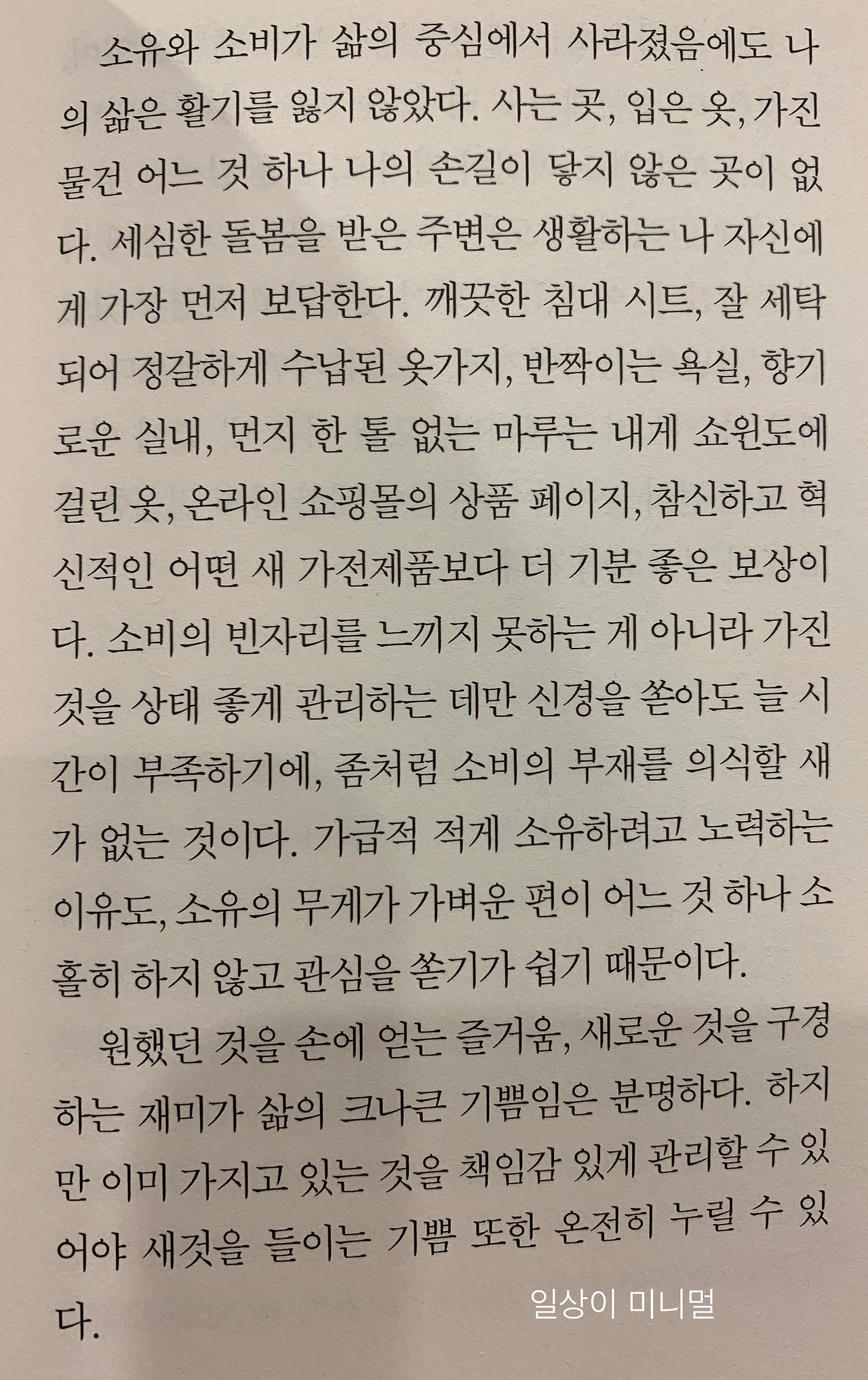 미니멀 라이프에 관한 책을 수없이 읽었지만 이 책은 다른 책에 비해 실제적인 이야기라기보다 라이프 철학에 관한 내용이다. 미니멀 라이프를 표방하듯 책 자체가 다른 책에 비해 작고 얇고, 내용도 군더더기가 없다. 책은 서가를 채우는 장서보다는 문고판을 지향해 사람들의 손에 들려있는 시간이 늘어나는 것이 중요하다는 생각을 갖고 있는데 그런 입장에서 본다면 휴대하기 간편하면서도 줄 그으며 읽을 수 있는 좋은 책이다. (물론 나는 이번에 도서관에서 빌려 읽었지만)