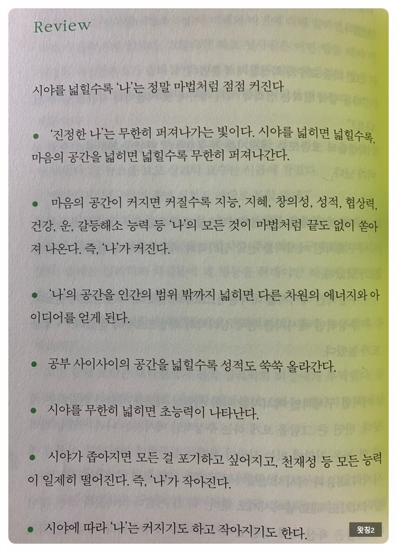 나는 원래 기독교인이라 사람의 몸과 영으로 나뉜다는 것을 알고 있었는데 이 책에서는 그것이 보다 과학적으로 증명되어 있었다. 책에서는 빛으로 표현이 되어 있고, 우리 몸 주변에 형성되어 있으며 사랑을 느낄수록 파장이 커진다고 하였다. 사실 눈으로 보지 않은 것은 믿기가 어려운 법이다. 여러 교수들의 수많은 실험 결과나 증언도 사실일까, 하는 생각이 많다. 하지만 저자가 말하고자 하는 것. 육신에 너무 갇히지 말고 넓게 생각하고 나의 상황을 객관적으로 바라보는 자세를 갖는다면 내가 당하는 일에 일희일비하지 않게 된다는 건 확실한 것 같다.