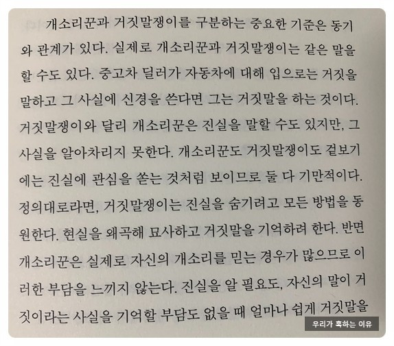 우리는 살면서 어떻게 저런 걸 믿는 사람이 있을까, 하고 생각할 때가 많다. 누군가는 나를 보고 그렇게 생각할지도 모른다. 신념이 강한 사람을 높이 평가하지만 잘못된 신념을 가진 사람의 결말은 좋지 못할 수도 있다. 무엇을 믿느냐, 무엇을 진실로 받아들이느냐는 그만큼 중요하다. 이 책을 보내주신다는 메일을 받고 사실은 엄청 망설였다. ‘사회심리학이 조목조목 가르쳐주는 개소리 탐지의 정석’이라는 부제 때문이었다. ‘개소리’라는 말이 마음에 걸렸다. 적어도 나에게는 욕처럼 들렸기 때문이다. 그런데 ‘사회심리학’이라는 말에 이 책의 제목처럼 혹했다. 받고 보니 책 표지의 장난스러운 그림과는 다르게 여러 가지 과학적 사실이나 상식과 그것들을 믿어야 하는지 아닌지에 관한 다소 딱딱한 내용의 책이었다. 어떤 면에서 배울 점이 많은 책이었는데 본문에 ‘개소리’라는 말이 너무나 많이 등장하여 나중에는 멀미가 날 정도였다. ‘개소리’의 원어는 ‘bullshit’으로 원래 원어로도 허튼소리라는 뜻도 있지만 욕설이라고 나온다. 계속 이 글자를 읽으니 기분이 점점 안 좋아지는 걸 느꼈다. 번역할 때 ‘허튼소리’로 했으면 좀 낫지 않았을까, 싶은 생각도 있었다.