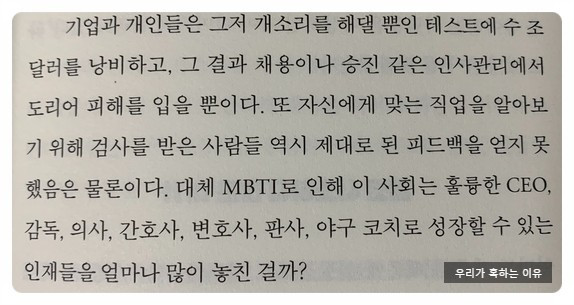 이 책은 우리가 마주치는 수많은 정보들을 받아들일 때 무분별하게 하기보다는 한 번쯤 질문해 보고 옳은지 판단해 보라는 귀중한 메시를 담고 있었다. 한 단어 때문에 계속 집중력이 분산되는 느낌이긴 했지만 말이다. 그래서일까 읽는 데 시간이 꽤 오래 걸렸다. 중간에 등장하는 예들이 낯설기도 했다. 처음 들어보는 과학적 사실들도 많았다. 그런 와중에 MBTI 같은 익숙한 개념은 머리에 쏙쏙 들어오기도 했다. 거의 대부분의 사람들이 상식으로 알고 있는 이 검사를 통해 사실은 많은 기회를 박탈당했을 수도 있다는 생각을 해본 적이 없었기 때문에 신선하게 다가왔다.