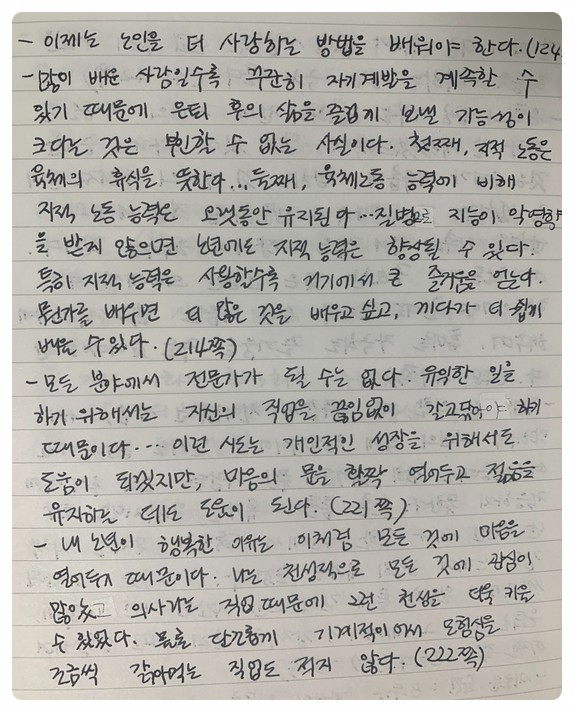 나이가 들면서 건강이 점점 나빠지는 경우를 생각하지 않을 수 없다. 아무리 젊었을 때 건강관리를 잘해도, 우리는 수명이 다하면 죽음에 이르게 된다. 누구에게도 예외는 없는 것이다. 하지만 자신이 할 수 있는 한 잘 관리하고 대비한다면 고통의 시기를 늦출 수도 있고, 건강이 나빠진 후에도 그로 인한 부작용을 줄일 수 있다. 눈이 어두워질 것을 대비하여 점자를 미리 배워둔다는 것도 굉장히 의미심장했다. 물론 눈이 안 보이면 읽어주는 책을 들으면 되지만 시력이 약해지면 청각도 약해질 것이 분명하므로 점자는 매우 유용할 것 같다.