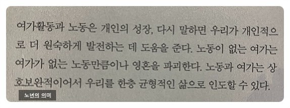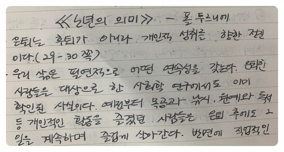 노년의 삶을 풍요롭게 누리기 위해서는 젊은 시절의 준비가 필요하다. 여기서 말하는 준비란 비단 경제적 여유만을 말하는 것은 아니다. 은퇴 이후 많아진 시간을 의미 없이 무료하게 보내는 이들은 젊은 시절 짬짬이 취미활동을 하지 않고 일에만 매달렸던 사람들이 많다는 말이 계속 나온다. 생각해 보면 주변에 젊은 시절 활발하게 무언가를 배우거나 활동했던 분들이 나이 들어서도 비슷한 생활을 하고 있음을 알 수 있다. 물론 나이 들어서까지 지나친 욕심을 부리며 ‘나 아니면 안 돼’ 하는 마음을 내려놓지 못하는 것을 이 책에서도 경계한다. 내가 이루기 어려운 것을 내려놓고, 새로운 것에 도전하는 용기가 노년에도 필요하다는 말이다. 이 말에 무척 공감이 되었다. 축구를 잘하던 사람 중 몸이 더 이상 따라주지 않음을 알고, 이후에도 축구 경기를 즐기고 아이들을 모아 가르치는 일에 애쓰는 리더가 있는가 하면 똑같은 경우 자신의 약함을 깨닫고 축구는 거들떠보지도 않은 채 한탄만 하는 사람도 있다. 저자가 든 이 사례를 마음에 새기고, 나이가 들어하던 걸 하지 못함을 안타까워하기보다는 다른 방법으로 즐기도록 해야겠다.