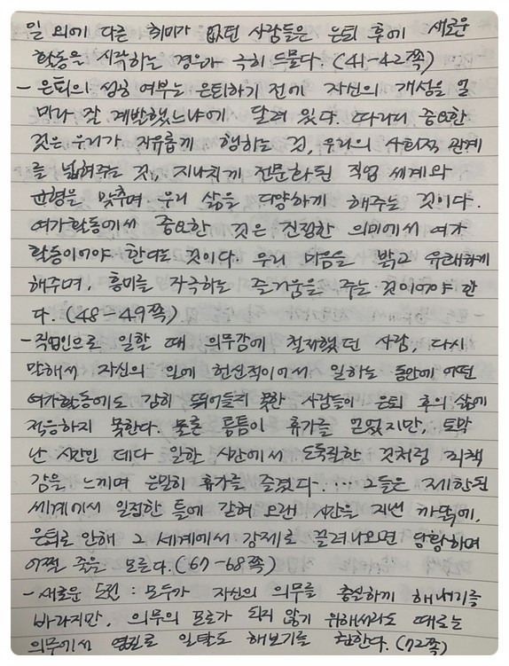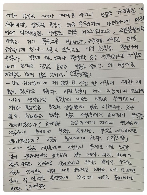 요즘 부쩍 은퇴 이후에 대한 생각을 하게 된다. 누구에게나 찾아오는 인생의 겨울을 대비하지 않으면 외롭고 쓸쓸할 것 같다는 생각이 든다. 사실 이 책을 만나게 된 것은 ‘미셸 투르니에’ 작가의 책을 도서관에서 검색하다 발견한 것이다. 어딘가에서 추천하는 걸 보고 읽어보고 싶어 투르니에만 메모했다가 미셸인지 폴인지 몰라 두 작가의 책 제목들 중 가장 끌렸던 이 책을 가져왔다. 나중에 알고 보니 미셸 투르니에의 책을 읽고 싶어 적는다는 게 투르니에만 적어두어 일어난 일이다. 이 책은 무척이나 깊이가 있었고, 내과의사이자 정신과 의사로 풍요로운 노년의 세월을 보내면서 썼기에 공감 가는 부분들이 많았다. 기독교를 바탕 한 그의 인생에 대한 철학적 고찰도 좋았다. 다음에는 미셸 투르니에의 책도 만나 보아야겠다.