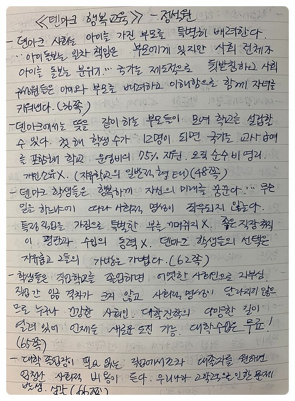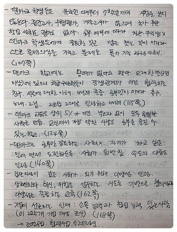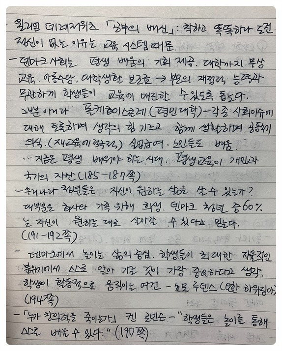 우리나라 사교육 시장은 어마어마하다. 그야말로 교육이 사업이 되었다. 가정에서 지출하는 비용도 그만큼 크다. 가진 돈에 따라 교육 기회는 달라지고, 가난은 대물림된다. 건강한 사회가 되기 위해 교육 기회가 평등하고, 대학 학비 걱정 없이 배울 수 있으면 좋겠다. 대학을 가지 않아도 구할 수 있는 직업이 보다 많아졌으면 좋겠다. (덴마크는 비행기 기장도 대학 졸업장이 필수가 아니라고 한다.) 전문 직업을 위한 교육시설에서 훈련을 받은 후 바로 사회에 진출할 기회를 열어 두고, 직업에 따른 수입의 차이를 줄이며, 대학은 반드시 스무 살 즈음에 가는 것이 아니라 평생 언제든 필요하면 가서 배울 수 있는 곳이 되었으면 좋겠다. 덴마크의 수업에서 아이디어를 얻을까 하고 빌렸다가 우리나라 사회구조에 대해 다시 생각해보게 된 책이다.
