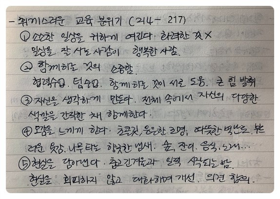 40년 간 행복 지수 최상위를 유지하고 있다는 덴마크의 행복 비결에 여러 가지가 있겠지만 교육이 그중 많은 부분을 차지하고 있을 거라고 생각된다. 덴마크는 교육 기회가 자라나는 아이들뿐 아니라 성인에게도 자유롭게 주어진다. 학벌을 중요하게 생각하지 않고 대학을 나오지 않아도 전문직에 종사할 수 있는 사회구조가 교육제도를 뒷받침한다. 시험이 거의 없어 학생들이 서로를 경쟁 상대라기보다 협력자로 생각하는 것도 다른 나라에 비해 학생들이 행복한 이유이기도 하다. 책을 읽는 내내 그런 점들이 정말 부러웠다.