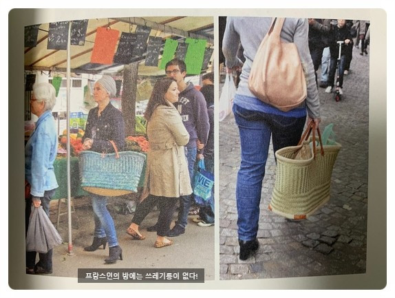 책 제목이 인상적인데 방에 쓰레기통이 없다면 쓰레기를 어디에 버린다는 것인지 궁금했다. 방에는 없지만 주방에 쓰레기통이 하나 있고, 가족 모두가 그 하나의 쓰레기통을 이용한다. 비닐 포장을 잘하지 않는 프랑스는 기본적으로 포장 쓰레기가 적다. 조각 케이크도 종이로 포장한다는 걸 보고 놀랐다. 갖가지 플라스틱과 비닐로 포장하는 우리나라와는 다른 모습이다.