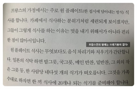 우리는 생필품이 떨어질까 봐 미리 사 두는 경우가 많은데 프랑스에서는 물건을 싸다고 많이 사서 쟁여두지 않는다고 한다. 그래서 수납 가구도 적고, 실제로도 물건을 많이 사 두지 않는다고 한다. 멋쟁이이지만 몇 가지 옷으로 멋을 내지 때마다 철마다 옷을 잔뜩 사지는 않는가 보다. 밥그릇, 국그릇, 반찬 그릇 그득한 우리 식사와 달리 접시 하나에 음식을 담아 먹는 프랑스는 식사 준비도, 설거지도 간편하다. 대신 육아 중에도 자신을 위한 배움이나 운동을 지속한다고 한다. 레스토랑에서의 식사도 좋지만 자연과 함께하는 피크닉도 즐기는 이들은 쇼핑보다 휴가를 좋아하고, 나이가 들어도 인생의 즐거움을 찾는 낭만적인 사람들이다.