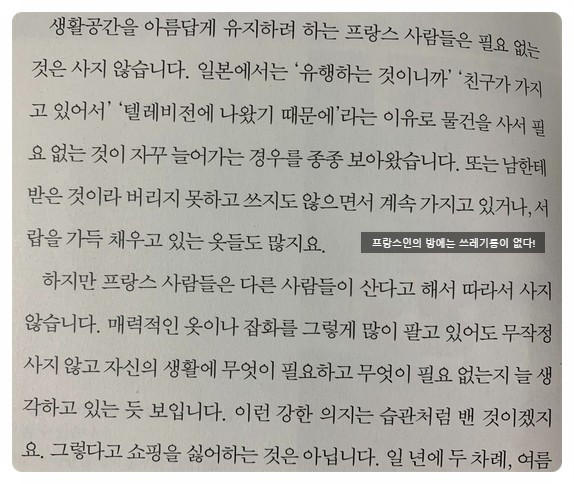일본 집에 비하면 넓은 프랑스의 집이지만 수납가구를 최소한으로 하고, 넓게 쓰는 것을 중요하게 생각하며, 소파는 공동 공간이므로 항상 정리해 두는 습관을 가지고 있고, 다른 이에게 선물을 줄 때는 보관이 용이한 것으로 생각해서 신중히 한다고 하니 배울 점이 참 많다. 무엇보다 자신의 삶을 최우선으로 생각하는 이들의 자신감이 오히려 남의 시선을 신경 쓰지 않고 살 수 있게 하는 것 같다. 과도한 포장을 줄이고, 불필요한 물건을 사서 쟁여두지 않으며, 나의 삶을 소중히 생각하고 즐기는 것, 나도 실천하고 싶다. 대형 쓰레기봉투를 구입해 두기만 하고 아직 집 정리를 하지 못하고 있는데 하루빨리 정리하여 항상 깔끔하고 넓게 유지하며 살아야겠다.