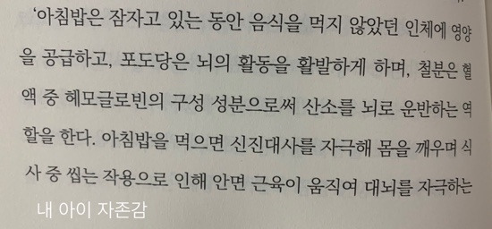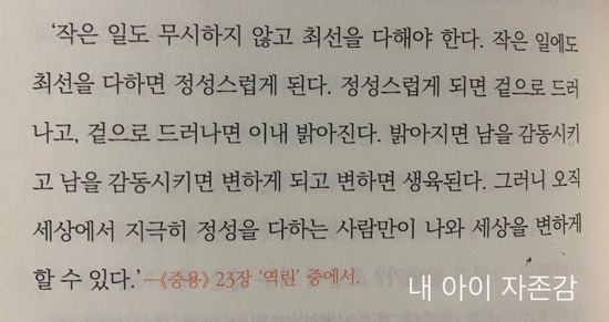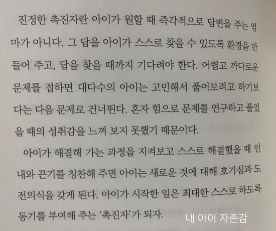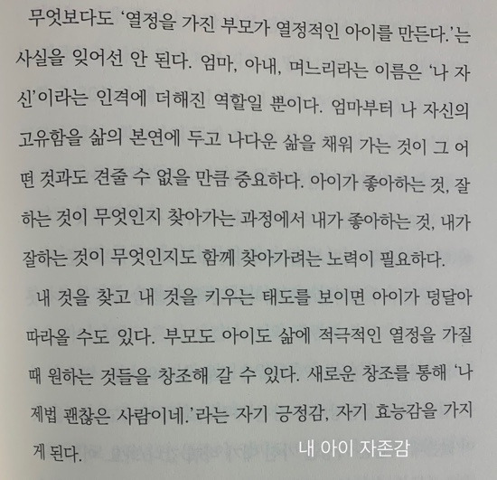 아이의 자존감을 위해 부모가 먼저 자신의 자존감을 챙기고 자녀에게 잔소리보다 너는 할 수 있다는 격려를 하는 것이 얼마나 중요한지 나의 부모님을 통해 알 수 있었다. 내 아이를 키우며 그것을 일관되게 실천하지 못한 것을 반성한다. 부모님은 항상 나와 동생들의 이야기를 잘 들어주셨고, 무엇이든 할 수 있다고 항상 말씀해 주셨다. 아이가 어렸을 때는 왜 진작 깨닫지 못했을까? 사춘기를 지나며 이 진리를 다시 떠올렸고, 지금은 틈 나는 대로 아이들에게 말해주려 한다. 조금만 더 빨랐으면 좋았겠지만 뒤늦게라도 그렇게 말할 수 있었음에 감사하며...