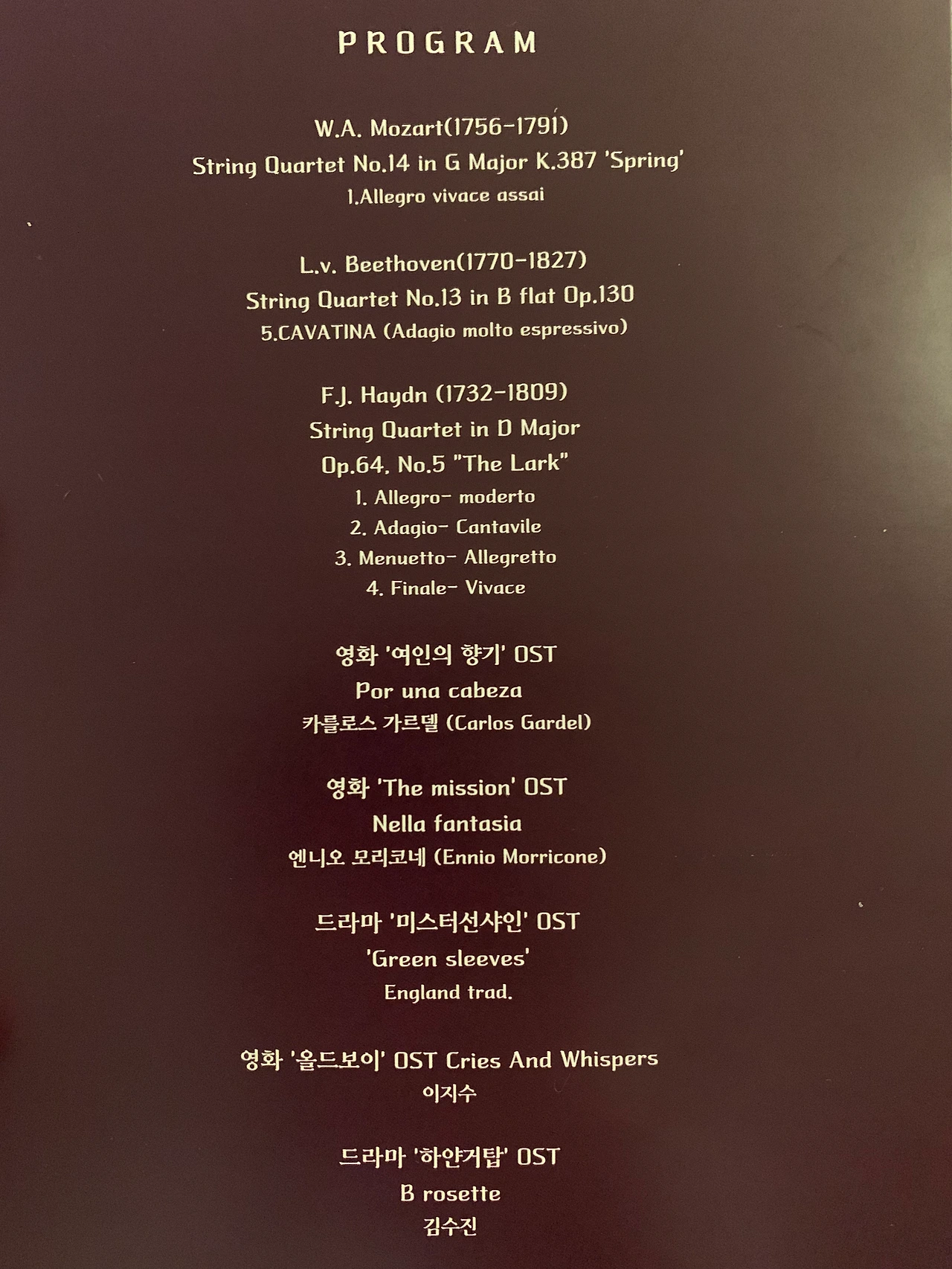 20분 전이라 아직 관객이 별로 없었다. 두 번째 줄에 자리 잡고 앉아 앙상블 팀을 기다렸다. 연주 시작 5분쯤 전 도착했다. 장소 찾느라 오래 걸렸고, 운전하신 분은 아직 자리 찾고 있다 했다. 연주가 시작되었고, 곡이 거듭될 때마다 박수소리가 점점 커졌다. 앞쪽은 클래식으로 뒤는 영화음악으로 짜여 있었는데 평소에 많이 듣던 익숙한 선율이 많아 부담 없고 편안했다. 이 팀의 특징이기도 한 것 같았다. 솔로를 골고루 나눠서 하는 걸 보니 인품 좋은 선생님의 배려가 느껴졌다. 네 분이 그동안 호흡을 많이 맞추셨나 보다. 남자 네 분의 콰르텟 공연이 흔치 않은데 참 멋지고도 따뜻한 연주여서 오래 기억에 남을 것 같다.