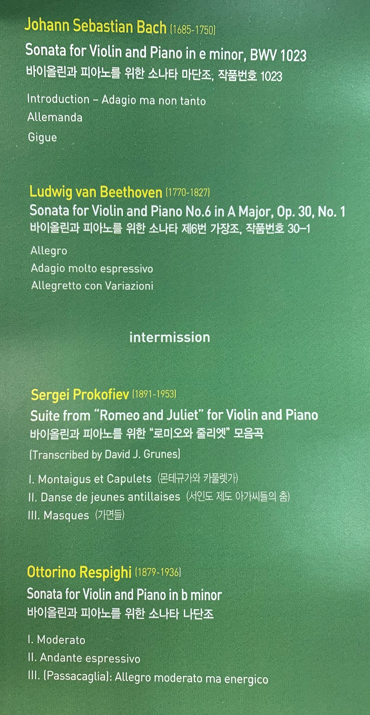 지하철이라 꽃을 못 샀는데 음식점 바로 앞에 꽃가게가 있어 얼른 하나 사고 연주회장으로 갔다. 1분 늦었는데 이미 첫 곡을 시작해 맨 뒤에 앉아 들었다. 바흐의 곡이 이렇게 감미로웠나 싶었다. 두 번째 곡 전에 앞으로 이동했다. 많이 돌아다녀서인지 너무 잔잔했는지 베토벤 곡에서 조금 졸았다. 인터미션 때 같이 보기로 한 친구가 뒤에 있다 내 옆으로 왔다. 로미오와 줄리엣은 많이 들었던 곡이지만 들을 때마다 재미있다. 마지막 곡은 처음이었는데 도악이 많고 하이 포지션도 많아 엄청 어려워 보였다. 지금까지 들은 교수님의 연주 중 최고였다. 연륜이 느껴지는 강렬하고도 세련된 연주였다. 이렇게 멋진 곡이 있었구나. 우리는 환호를 보냈다.
