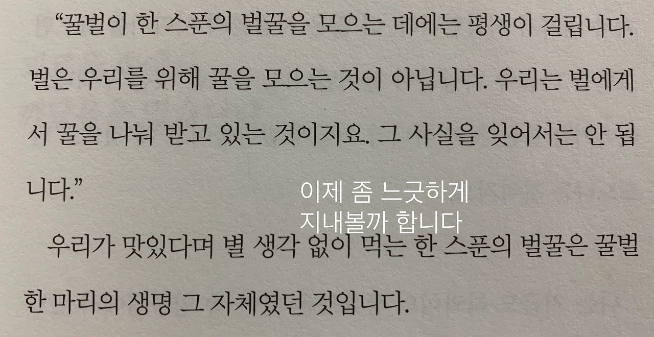 이 책의 저자는 아침에 일어나 먹는 소이밀크티에 정성을 들이는 느긋한 분이더. 내가 아침에 조금 더 일찍 일어나면 아침의 여유를 누릴 수 있을까? 분명 또 한 가지의 다른 일을 생각해낼 것이다. 중요한 건 마음이다. 쉬어도 돼. 다음에 해도 돼. 그렇게 미루기도 하지만 마음이 편하지는 않다. 어젯밤에도 휴일 마지막을 스터디카페에서 보낼까 하다가 넷플릭스 영화를 졸면서 보다 잤다. 한번쯤은 쉬어야 한다는 마음은 있지만 그게 일주일 내내 이어지면 기분이 좋지 않다.