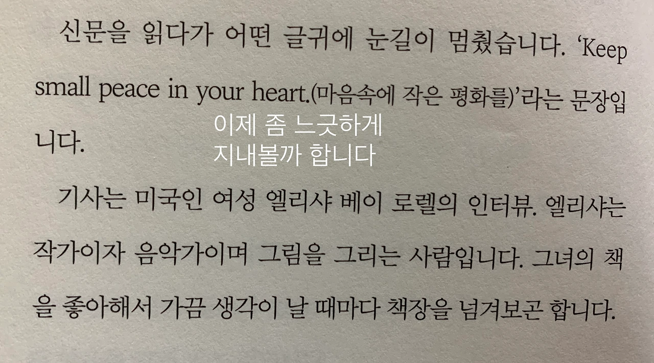 이 책에 특별히 대단한 내용은 없다. 여유 있는 저자의 마음처럼 책에는 여백이 많다. 나같이 성격 급한 사람은 리클라이너에 앉아 한 시간이면 읽을 내용이다. 하지만 나는 이 책을 읽는 동안 해야 하는데,의 늪에서 잠시 빠져나올 수 있었다. 책에 소개된 엘리샤 베이 로렐이라는 작가이자 음악가이자 화가의 책도 읽어보고 싳다. 오늘은 마음이나마 느긋해지자. 마음으로 계속 되뇌어야 한다.