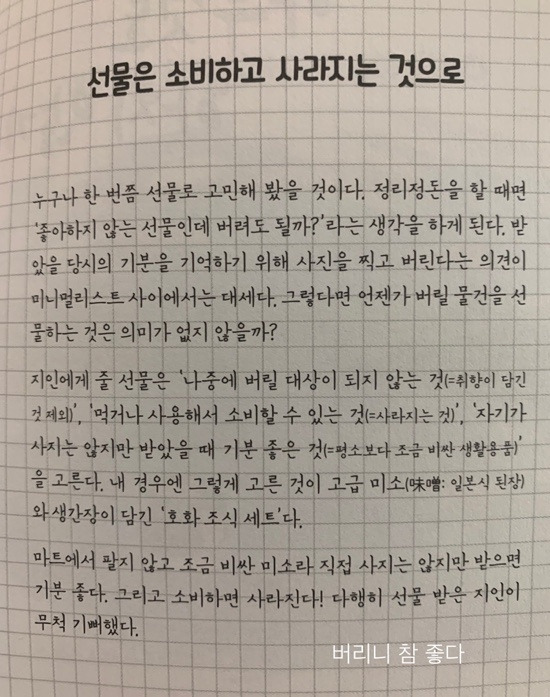 좁디좁은 일본의 집에서 살기 위해서는 짐을 쌓아둘 수가 없다. 일본에서 미니멀 라이프가 먼저 발달했는지는 모르지만 초창기엔 대부분 일본 저자의 책들이 많았다. 2016년도에 이 책으로 리뷰 쓴 게 있었다. 어쩐지 너무나 낯이 익다 했었다. 예전에는 읽은 책 다시 잘 안 읽고, 본 영화 다시 잘 안 보는 편이었는데 나이가 들어서 그런지 다시 읽고 싶은 마음이 생긴다. 그런데 신기한 건 오래전 그때와 느낌이 사뭇 다르다는 점이다.