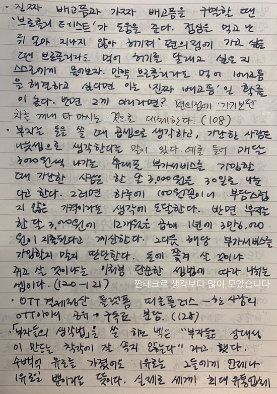 책 내용 중 ‘부자는 돈을 쓸 때 곱셈으로 생각하고, 가난한 사람은 나눗셈으로 생각한다’는 말이 딱 맞는 것 같아 무릎을 쳤다. 주변에 보면 정말 물건 값을 나눠 ‘하루에 얼마 꼴’인 적은 돈이라 말하는 사람 중 부유한 사람이 없다. 매월 얼마씩이면 1년이면 얼마, 하는 계산을 하던 알뜰한 사람들도 떠오른다. 생각해 보면 할부를 싫어하는 나는 곱셈까지는 아니지만 적어도 나눗셈은 하지 않는 것 같다. 앞으로는 곱셈 계산법으로 살아야겠다.