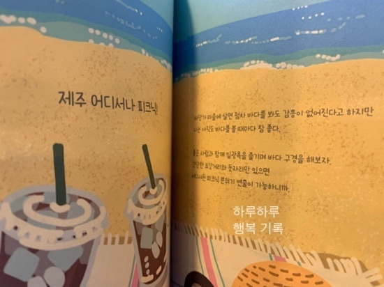 이 책은 1월부터 12월로 챕터가 나뉘어 있다. 각 달의 주제가 있고, 그에 맞는 이야기와 그림들이 담겨 있다. 제주는 사계절이 아름다운 곳이므로 어느 계절에 가도 좋지만 유채꽃과 수국이 피는 봄에 가면 날씨도 좋고 볼거리도 많을 것 같다는 생각이 들었다. 은퇴 후에나 가능한 일이겠지만. 바다를 좋아하는 나는 제주는 어느 곳이나 피크닉 장소가 된다는 말이 너무 부러웠다.