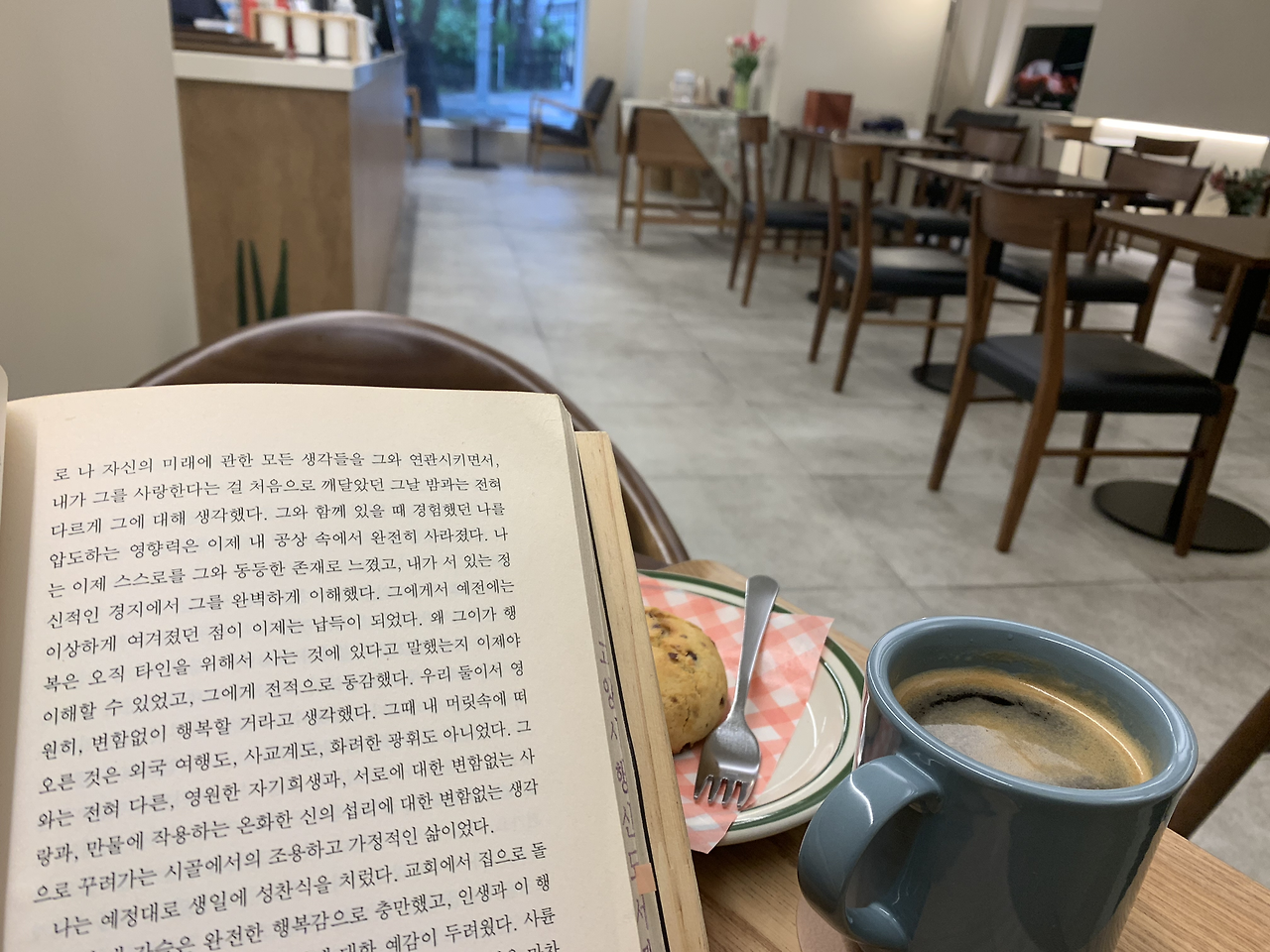 데려다주는 길 명랑한 딸을 보니 걱정은 안 된다. 시험에 꼭 합격하길 바라는 마음으로 내려주고 근처에서 카페를 찾다가 아름다운 장소를 발견했다. 공원 옆에 자리하여 공원에 차를 대고 들어와 앉았다. 두 시간 동안 응원하며 책을 읽었다.