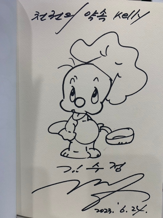 토요일 저녁 늦은 시간이었는데도 한참 동안 식사를 하고, 마지막에는 가져오신 책(미리 그림과 사인을 해 두신)에 조카손주들 이름을 하나씩 적어주셨다. 나도 한 권 받았다. 책이 다 떨어진 후에도 A4에 그림과 사인을 해 주시느라 고생하셨다. 우리 집 막내는 친구들에게 부탁받은 싸인을 세 장이나 받고 행복해했다.