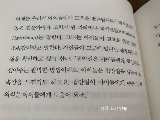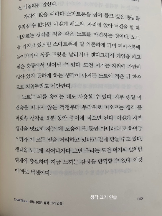 집은 우리에게 휴식처라 생각하지만 오히려 스트레스를 유발하는 곳이 되기도 한다고 저자는 말한다. 집안일이 보이고, 해야 할 일들이 생각나기 때문이다. 때로 근처 카페에서 맛있는 것을 먹으며 시간을 보내는 것을 권한다. 그렇다고 닉센 자체가 또 하나의 일이 되어서는 안 된다. 소파에 앉아서 아무것도 하지 않고 쉬는 시간을 내지 못한다고 해서 스트레스받으면 안 된다. 닉센의 방법 또한 마찬가지다. 누군가는 소파에서 시간을 보내지만 때로 음악 듣기나 만들기, 산책이나 자전거 등이 닉센이 될 수도 있다. 사람마다 여유를 느끼는 행위가 다르기 때문이다. 때로 ‘몰입’하는 것도 닉센이다. 칙센트미하이는 동명의 책에서 말하였다. 내가 태권도하고 바이올린 하며 몰입하는 시간이 어쩌면 나에게 닉센일 수 있다. 몰입경험은 사람을 행복하게 해 주기 때문이다. (258쪽)