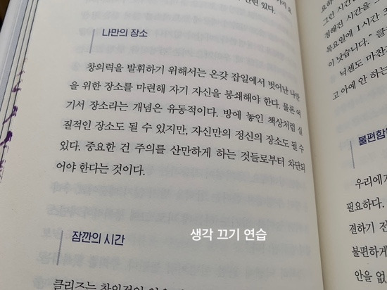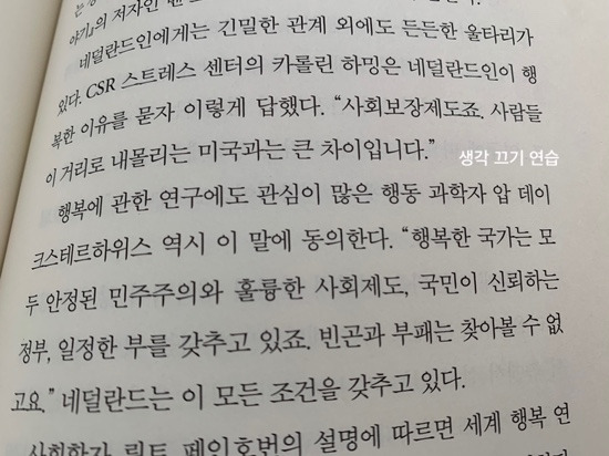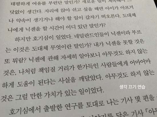 고성에 가서 읽으려고 도서관에서 빌렸다. 여러 권을 챙겼지만 이 책 한 권 제대로 읽고 왔다. 생각보다 2박 3일은 길지 않은 시간이었다. 생각을 끄러 간 거라 이 책이 여행의 주제와 잘 어울리긴 했다. 책을 읽다 보니 평소에 내가 생각하는 삶과는 조금 달라 신선했다. 얼마 전에 읽은 ‘역행자’에서 충분한 수면과 멍 때리는 시간이 창의성을 위해 얼마나 중요한지에 대한 내용을 보고 놀란 것과 비슷한 맥락이다. 이 책에서는 네덜란드의 ‘닉센’을 추구하자고 소개가 되어 있다. 닉센을 찾아보니 ‘생각에 잠기다’라는 의미였다. 오랫동안 행복지수 10위 안에 들었고, 특히 청소년의 행복지수가 1위인 이유가 네덜란드는 노동 시간이 짧고 아무것도 하지 않는 ‘닉센’을 소중한 가치로 여기고 있기 때문이 아닐까?