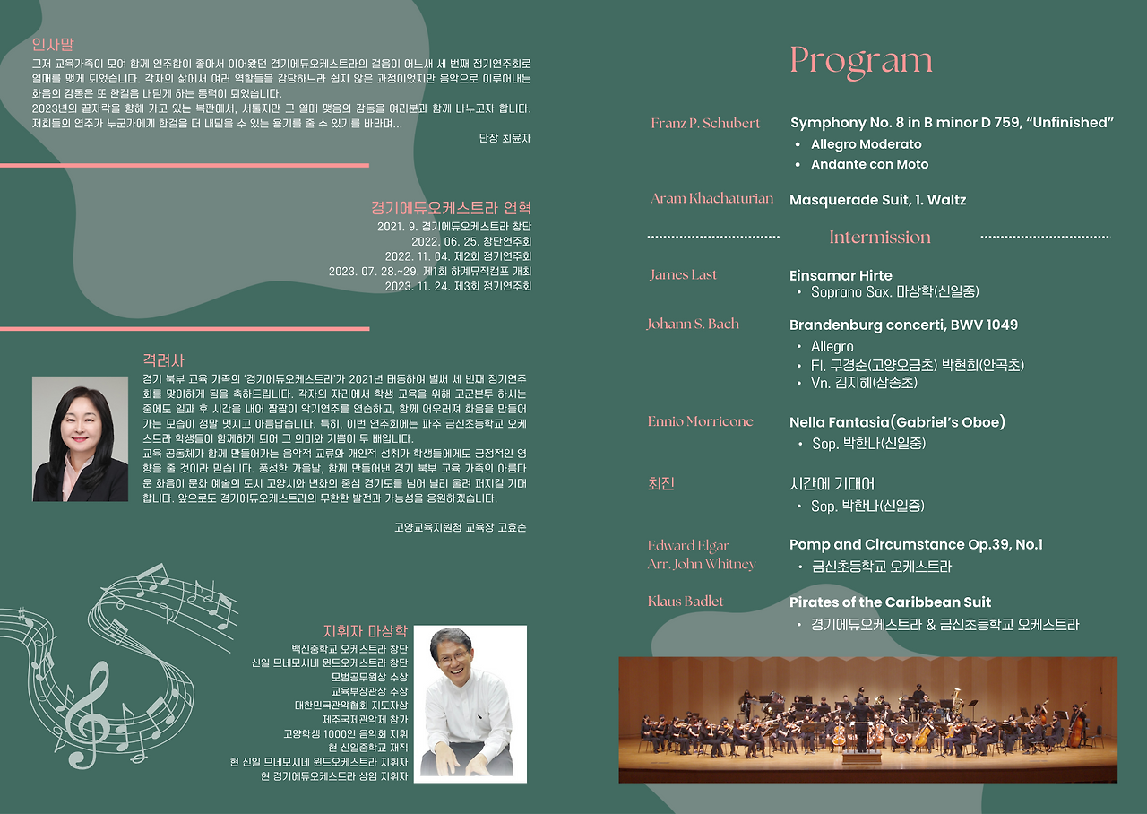올해는 파주 금신초등학교가 함께 연주해 교육 가족의 오케스트라임을 빛내줄 예정이다. 저번에 아이들 연습 현장에 갔는데 생각보다 잘해서 놀랐다. 작년 이맘때 처음 활을 잡은 아이들도 있다더니 역시 아이들의 성장 속도는 눈부시다. 전공자가 별로 없고 관악기 대부분은 중학생이기도 하여 부족한 부분이 많겠지만 감동이 있는 멋진 연주회가 되었으면 좋겠다. 3년 전 코로나 와중에 생긴 에듀오케스트라의 공연 소식이 이번에 지역 신문에 기사로 나기도 했다. 이제 조금씩 자리 잡아가는 경기 북부지역 교육 가족 에듀 오케스트라가 오래오래 이어져 많은 이들이 꿈을 펼치는 장이 되기를 기원한다.