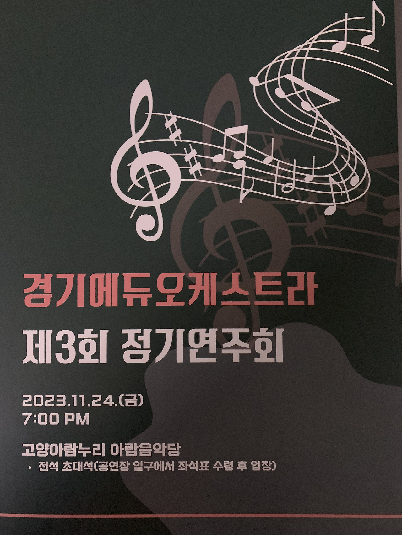 11월 24일 금요일에 경기에듀오케스트라의 제3회 정기연주회가 있다. 전석 무료이므로 오시는 분들은 바로 카운터에서 표를 받으시면 된다. 요즘 연주회 연습 준비로 매주 화요일에 모이던 것을 금요일도 추가했다. 주 2회 연습에 가니 보고 싶은 얼굴을 자주 볼 수 있어 좋긴 하지만 분주하기도 하다. 금요일은 연습 직후 태권도에 가야 해서 도복을 차에 미리 챙긴다. 분주함은 다음 주 공연이 끝나면 조금 나아질 것이다. 내년은 10월에 연주하자고 해 봐야겠다. 퇴근 후 바로 가야 해서 악기를 미리 챙겨 출근하고 있어 추운 날 하루종일 차에 악기를 두기가 걱정되기도 한다. 담요로 싸서 트렁크에 넣고 햇볕 잘 드는 곳에 두었는데도 저녁에 연습하려고 꺼내니 너무 차갑고 줄이 풀려 있었다.