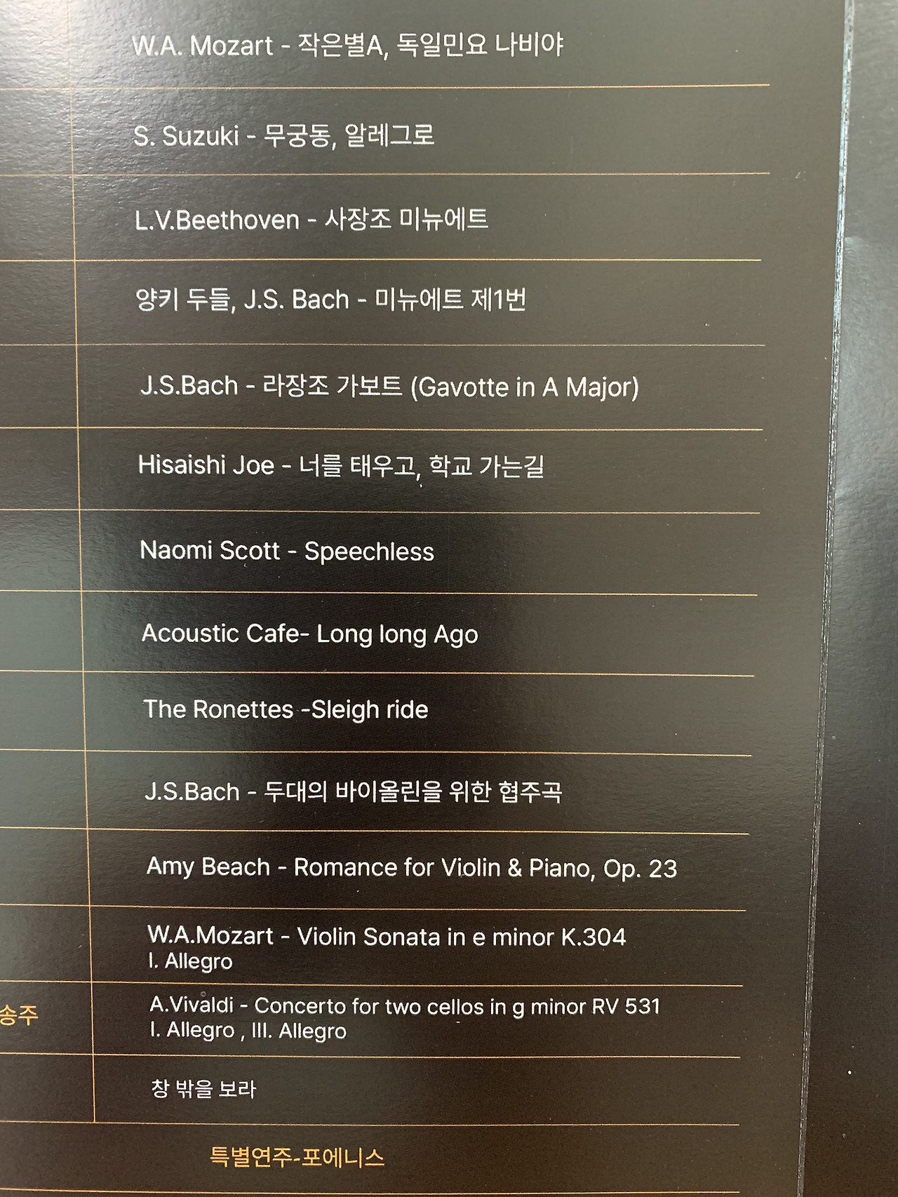 거리연주를 하며 알게 된 바이올린 선생님의 두 번째 제자 연주회가 있었다. 작년에 이어 이번에도 한 곡 참가했다. 오케스트라 공연 후 3주 정도의 시간이 있었지만 어려운 곡을 하기에는 시간이 빠듯할 것 같아 고민하다 그전부터 해보고 싶었던 모차르트 소나타 28번을 골랐다. 5분 정도로 해야 해서 1악장만 반복 없이 하기로 하고 김봄소리 님의 공연 영상을 보며 활표시를 하고 읽어보았다. 숨고에서 알게 되어 곡 읽을 때 가끔 배우는 레슨 선생님께 레슨을 한 번 받으며 내가 잘못 읽은 부분이나 중점을 두어야 할 내용을 배웠다. 그 후 약 2주 동안 매일 조금씩 연습했다.