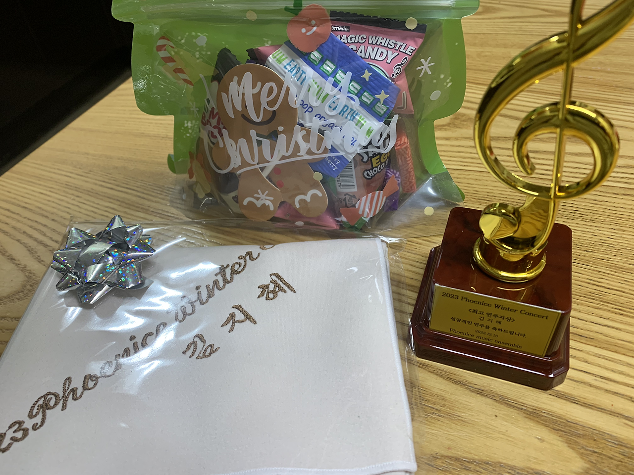 마치고 나오면서 우리를 위해 준비하신 선물을 보고 놀랐다. 예쁜 높은음자리표 트로피와 도톰한 융에는 이름까지 새겨 주셔서 감동받았다. 바이올린만 잘하시는 게 아니라 공연을 기획해서 성공적으로 해내시고 기념품까지 센스 있게 마련하신 선생님이 정말 대단해 보였다. 힘들 것 같은데 연신 재미있다고 상기된 얼굴로 이야기하시는 걸 보니 덩달아 힘이 났다. 짧은 시간에 곡을 완성해 무대에 섰다는 것이 무엇보다 기뻤고, 이런 기회를 주신 선생님께 감사한 마음이 들었다. 참가한 아이들과 성인 제자분들에게도 소중한 시간이었을 것이다. 애써 연습하고 멋진 연주를 한 모든 이에게 박수를 드리고 싶다.