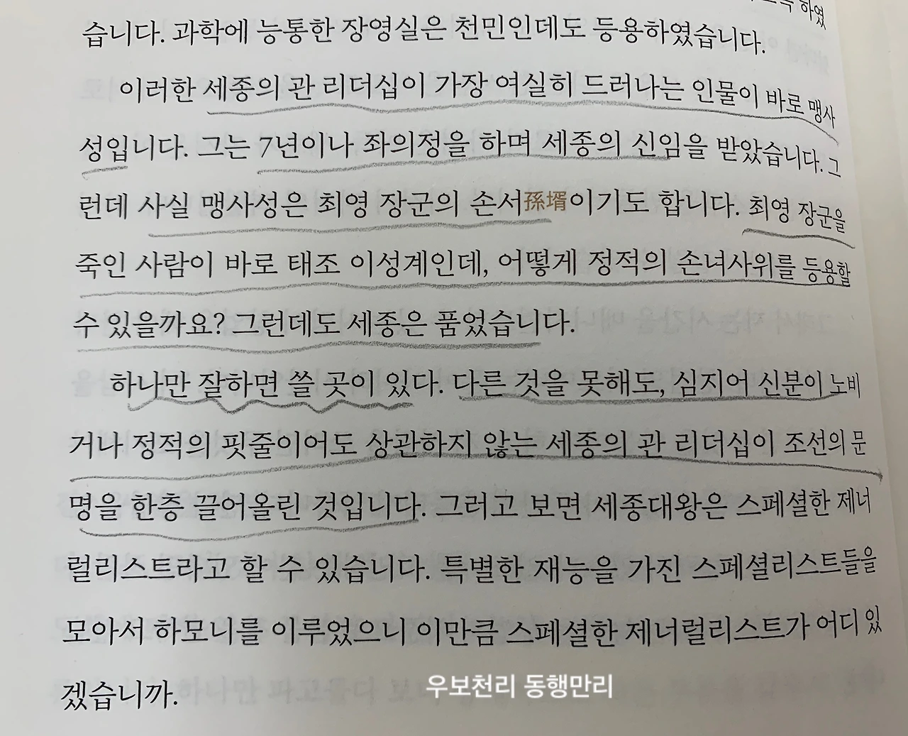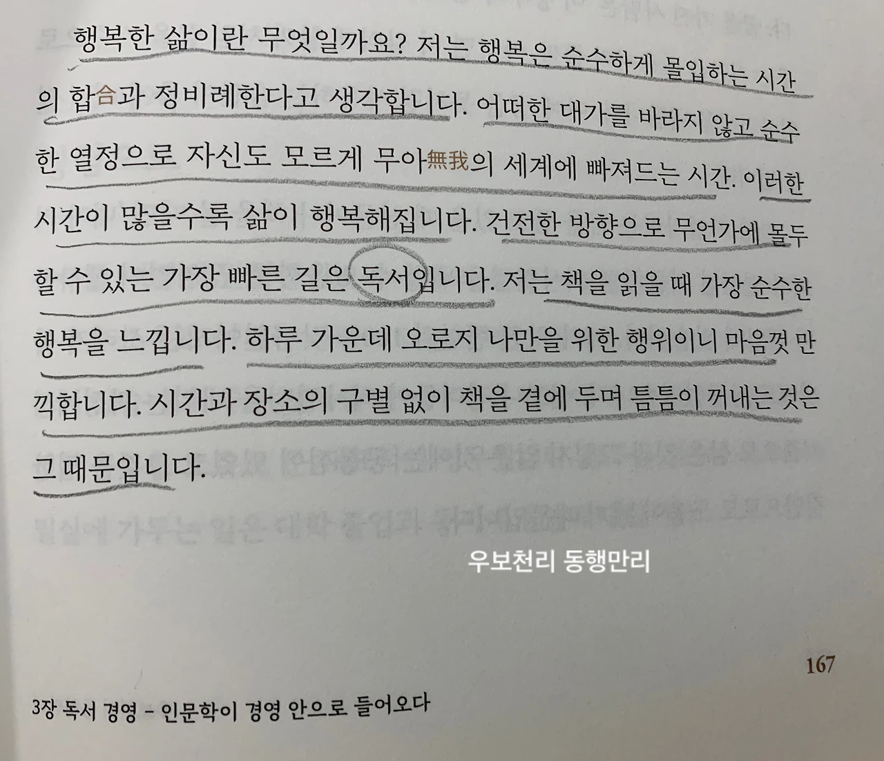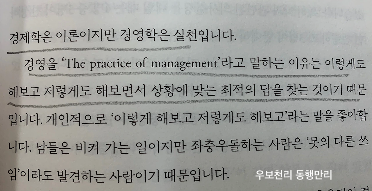 책은 크게 네 부분으로 나뉘다. 1장은 가치경영으로 흔들리지 않는 삶의 기준을 세우는 내용이 있다. 때로 포기할 줄 알고, 남에게 친절을 베풀되 받을 것을 생각하지 말라는 지리를 담고 있다. 2장은 사람 경영으로 사람을 알면 경영이 보인다는 주제로 세종대왕의 리더십을 비롯하여 사람을 대하는 방법이 나와 있다. 혼자 독식하기보다 다른 이를 위해 남길 줄 아는 여유를 갖는 것이 좋다. 3장은 독서경영으로 인문학을 어떻게 경영에 도입하는지 예로 든다. 그의 세 가지 독서습관에 공감이 갔다. 직원들은 모두 책을 읽고 리뷰를 올린다고 한다. 회사가 발전하지 않을 수 없다. 4장은 역사 경영으로 이순신의 경영 철학을 담았다. 얼마 전에 읽은 ‘칼의 노래’에 나오는 통행첩 발행으로 어민에게도 좋고, 곡식을 얻어 좋았던 일석이조의 아이디어나 땅을 개간해 농사를 짓고 물고기를 팔아 식량이나 무기 생산을 위한 철을 확보하는 등 이순신 장군의 기개와 지혜를 흥미롭게 읽었다.