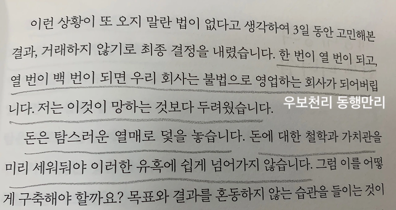 기업가나 유명인의 책을 읽는 것을 좋아한다. 배울 점이 많은 분이 쓴 글이라면 마다할 이유가 없다. 이 책은 기대했던 것보다 훨씬 좋은 내용으로 가득 차 있었다. 줄을 그으며 읽었고, 가족에게 꼭 읽어보라고 권하고 싶다. 오래전 한국콜마라는 회사가 많은 화장품 회사에 재료를 납품하는 회사라는 것 정도로만 알고 있었고, 화장품에 큰 관심이 없는 나는 잊고 지냈다. 책으로 다시 만난 이 회사는 아마도 그때보다 훨씬 성장해 있는 것처럼 보였다. 수많은 제품을 생산하고, 최고의 기술을 위해 끊임없이 연구하는 곳이라는 것을 알았다. 앞으로도 더 발전할 것이다. 중견기업으로 키워낸 회장님이 너무 멋지다. 올바른 리더의 본을 잘 보여준 분이다. 방학 마지막 날 아이들에 들려줄 이야기가 생겼다.