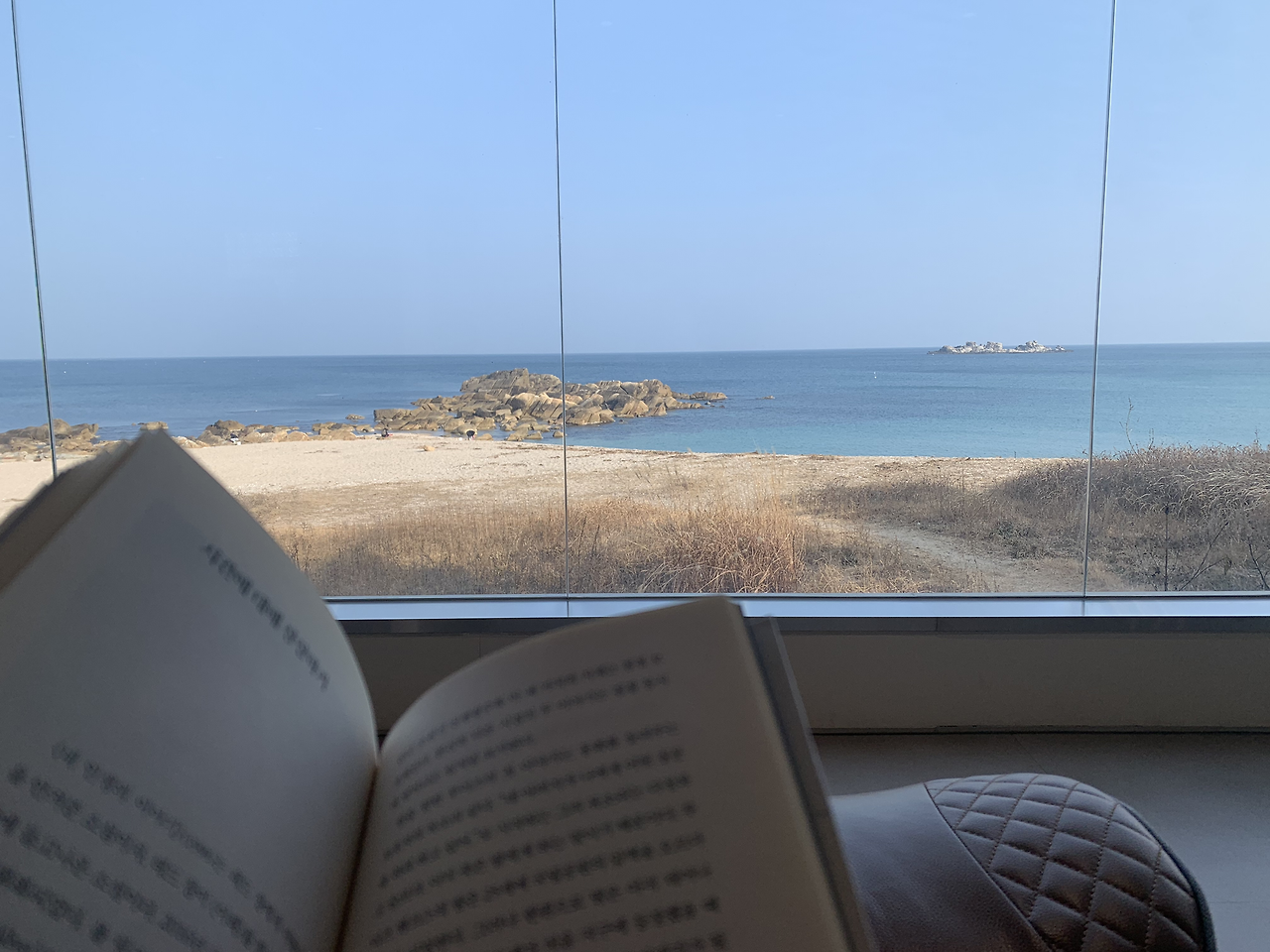 이쪽에서 유명한 막국수집이 아닌 지난여름에 갔던 막국수집에 갔다. 반찬으로 나오는 명태 회무침이 너무 맛있었던 기억이 나서였다. 이번에도 감칠맛 나는 회무침 덕분에 막국수 한 그릇을 뚝딱 해치웠다. 부른 배를 두드리며 해변으로 향했다. 여름에 앉았던 카페가 그리웠다. 기억을 더듬어 잘 찾았다. 아름다운 해변이 바로 보이는 2층 자리에서 달콤하고 부드러운 초코 라테를 먹으며 아까 산 책을 읽었다. 내가 앉아 있었던 한 시간 반 동안 자매로 보이는 여자 아이 둘이 내내 모래사장에서 놀고 있었다.