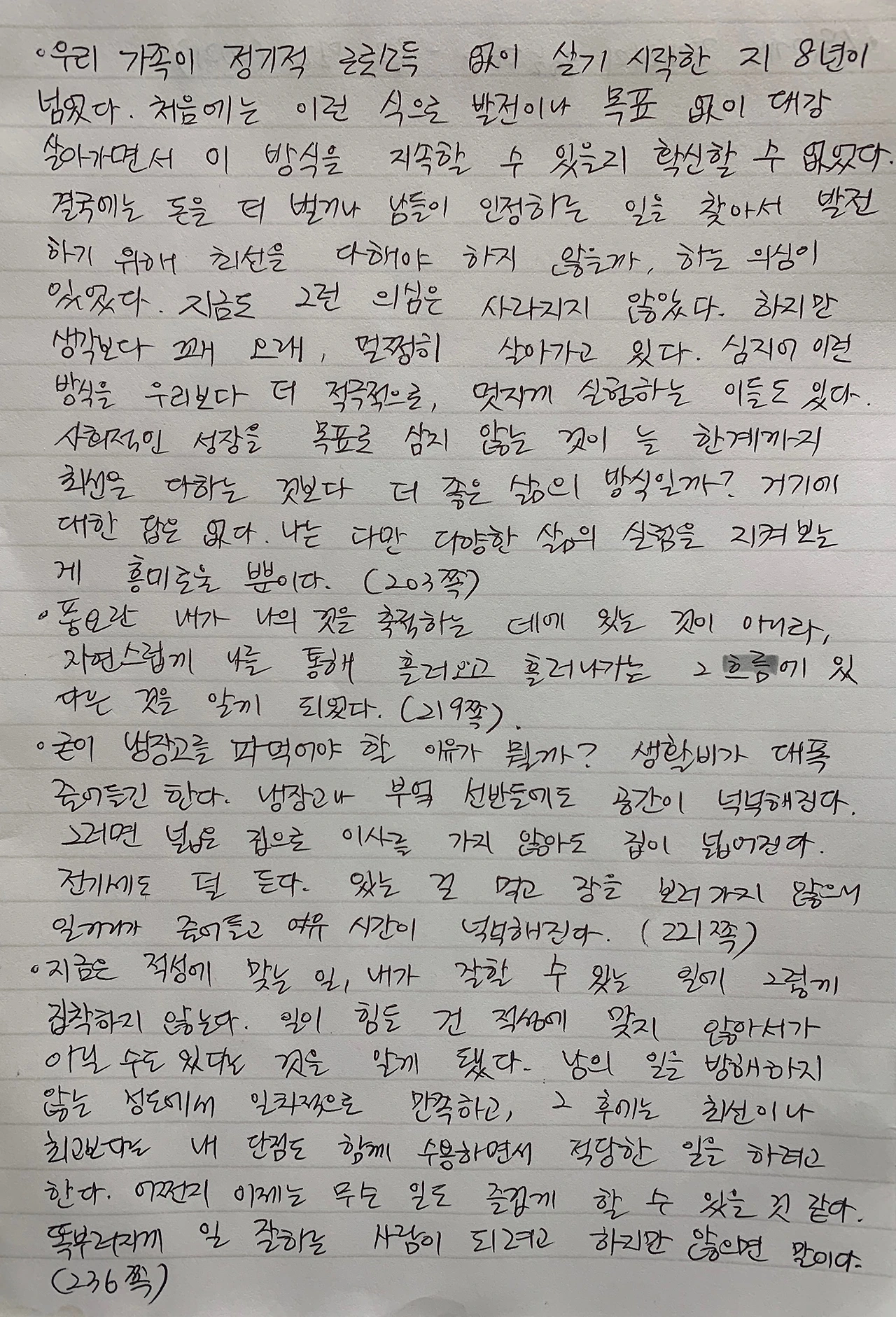 물가가 비싼 미국에서 월 100만 원 좀 넘는 생활비로 산다는 게 가능한 일일까? 대부분의 돈은 차에 들어간다고 한다. 한 대의 차로 온 식구가 움직이는 것은 불편할지도 모르지만 그 덕분에 가족의 인맥을 서로 알아간다. 냉장고 파먹기를 취미로 하고, 아울렛에서 저렴한 식재료 사는 것을 부끄러워하지 않는다. 저자가 먼저 썼던 <숲 속의 자본주의자>라는 책에서 아마 그에 대해 더 자세히 말하지 않았을까 싶다.