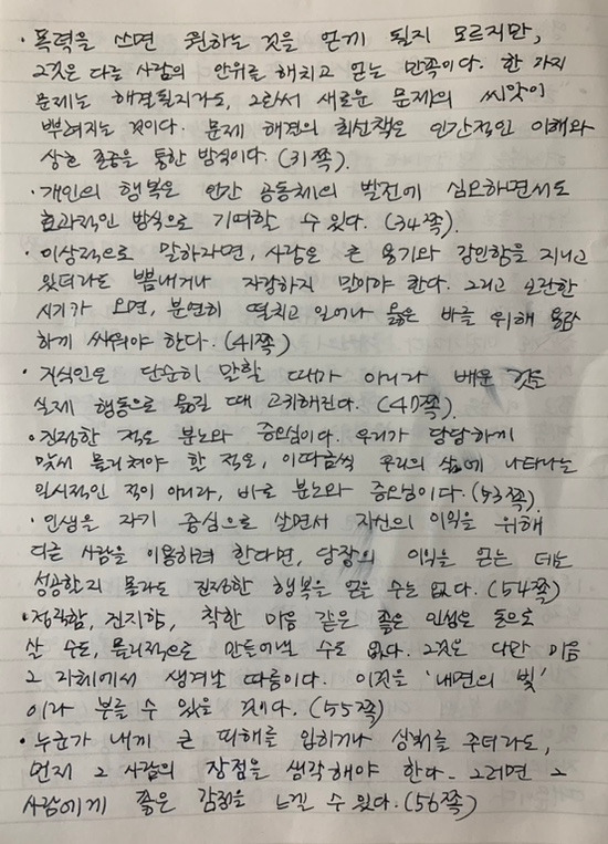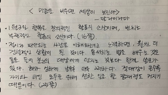 이 책을 읽은 후 처음 책에 대해 가졌던 생각이 완전히 바뀌었다. 처음에는 한 승려의 덕담 정도로 생각하며 책을 펼쳤다. 마지막 장을 덮을 때는 그의 큰 슬픔과 그럼에도 의연함에 숙연해졌다. 1월부터 12월까지 날짜별로 매일 짧은 글이 한 편씩 실려 있는데 이분이 일 년 동안 매일 글을 쓴 것은 아닌 것 같고 그가 쓴 글들을 365일로 나눠 매일 한 편씩 읽기 좋게 편집한 것 같다. 한 편씩 묵상해도 좋겠지만 나는 내리읽었다.