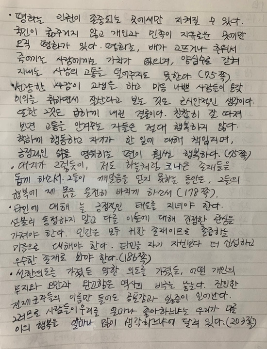 책의 내용이 불교에 바탕하고 있지만 인류애와 사랑 그리고 자비라는 보편적인 진리를 다루고 있어 읽기에 좋았다. 적대감이 클수록 자기와 타인 모두를 위해 선한 일을 할 잠재력이 커진다는 그는 나라를 빼앗긴 설움마저도 선한 일의 기회로 삼고 있는 것이 아닐까? 누군가가 자신에게 큰 피해를 입히거나 상처를 주더라도 그 사람의 장점을 생각해 좋은 감정을 느끼라고 말하지만 실천하기는 정말 어려운 일이다. 이렇게까지 할 수 있는 사람은 경지에 올랐다고 생각한다. 사는 동안 나에게도 그런 너그러움이 있기를.