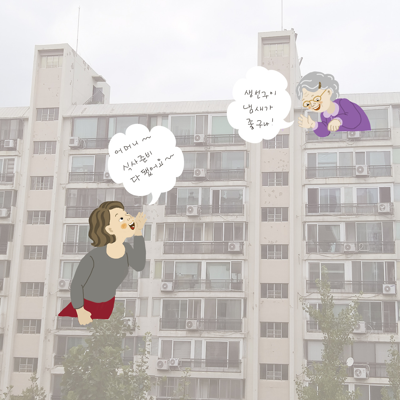 "며느리랑 바로 옆집에 살아요. 창문 열고 어머니~하고 부르면 가서 맛있게 먹는답니다.호호호." 어머니 생각 속의 며느리집은 퍽 가깝다.