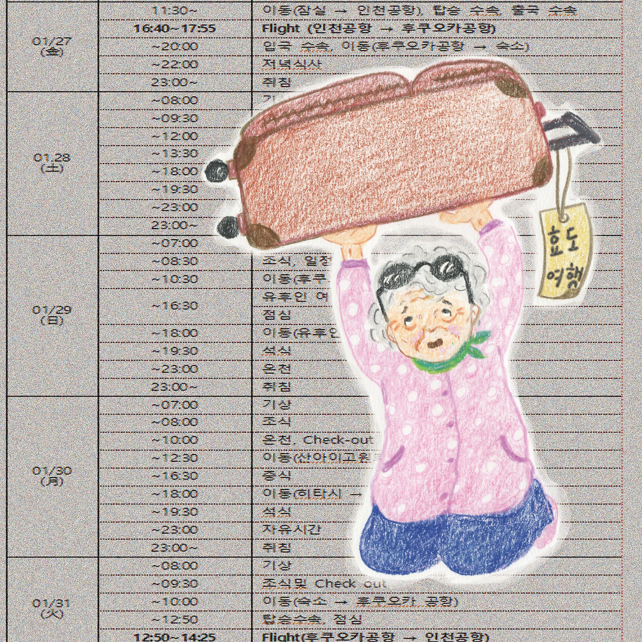 잘 걷는 것을 자랑삼아 말씀하는 와중에도 숨 가빠하는 어머니를 좀 쉬게 해 드릴 궁리는 하지 않고 입에 발린 감탄사만 남발하며 걸음 빠른 가족들에게 뒤처지지 않도록 뒤에서 밀면서 내 팔 아픈 걸 더 느끼는가 하면, 쇼핑을 좋아하는 어머니인데 집에 정리할 물건이 더 쌓이는 것을 우려한 나머지 소모 가능한가 아닌가 따져가며 섣불리 구매하지 않도록 사사건건 간섭하면서 여행의 큰 즐거움을 제한하기도 했다.