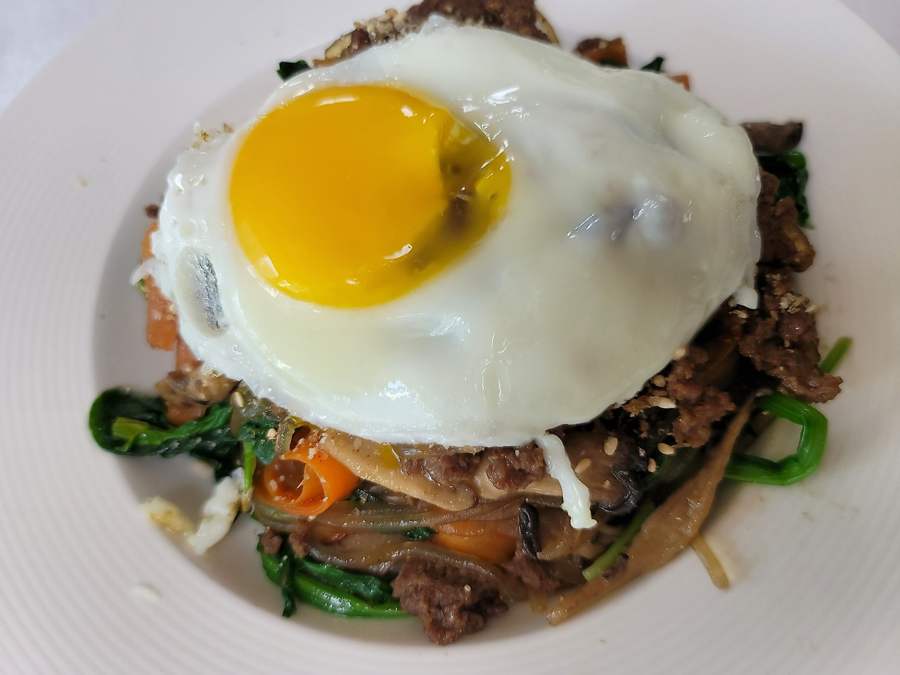 그 위에 노른자만 덜 익은 달걀 후라이를 얹어준다.